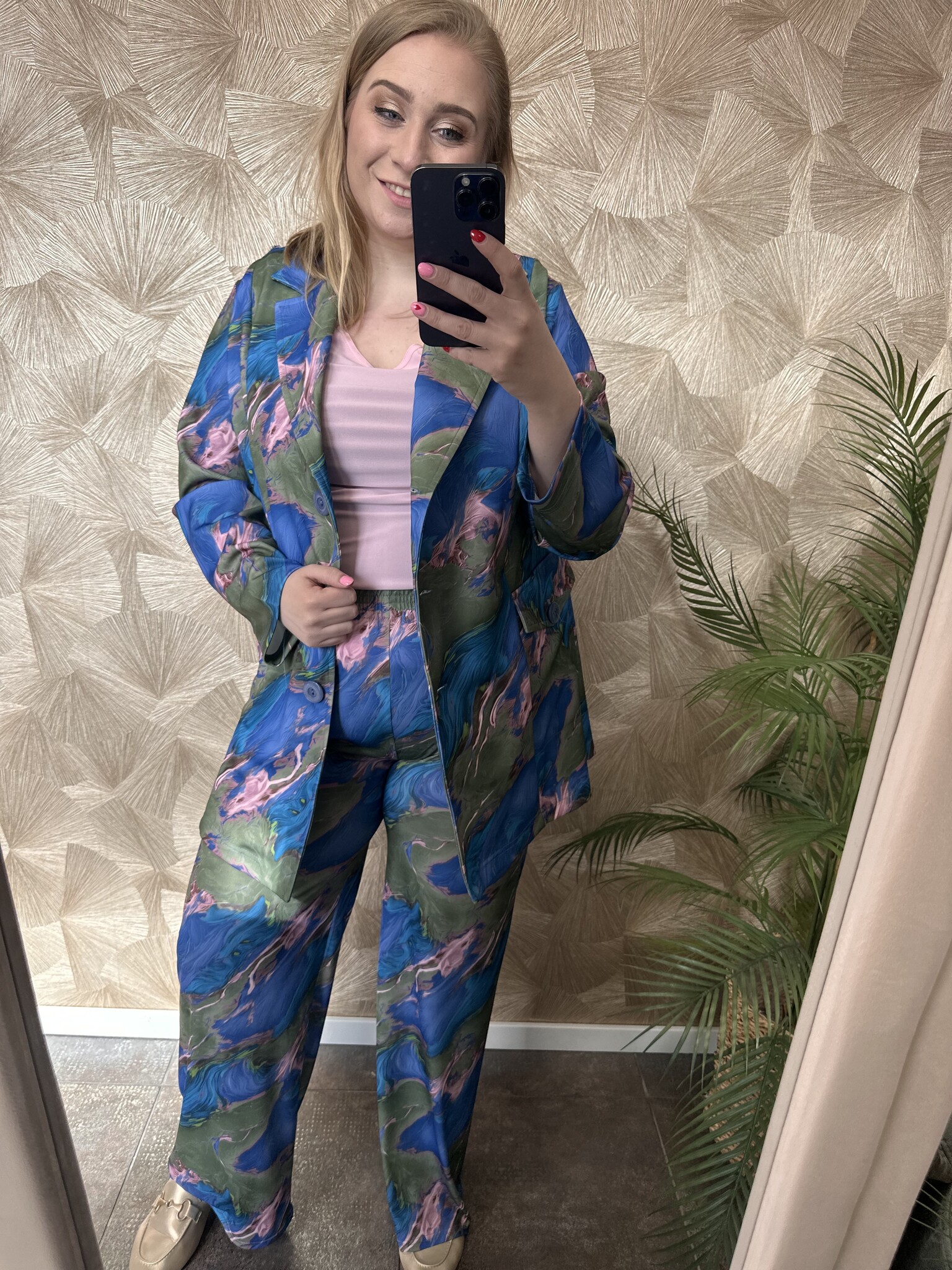 Deze blazer van Magna Fashion draagt elegant en heeft een losvallende pasvorm. De blazer heeft mooie kleuren met een marbleprint. Gemaakt van een luchtige stof dat zorgt voor een fijn draagcomfort. De blazer is afgewerkt met een knoopsluiting, zakken op de voorkant met knopen en schoudervullingen. Een chique blazer die leuk te combineren is met een top!