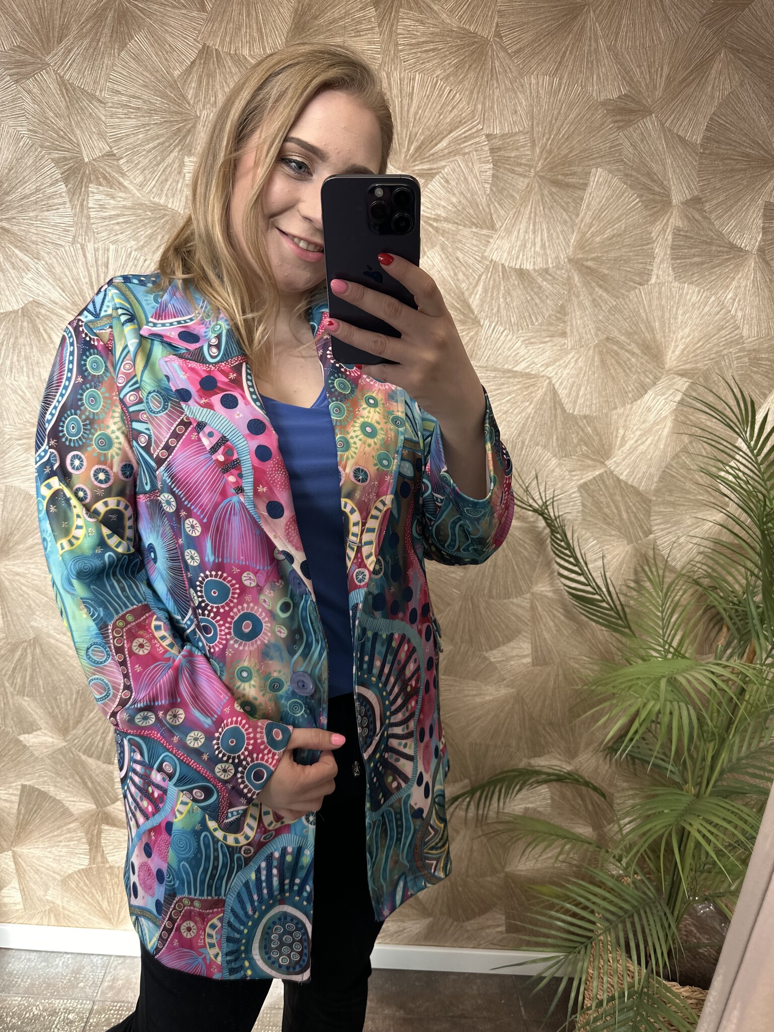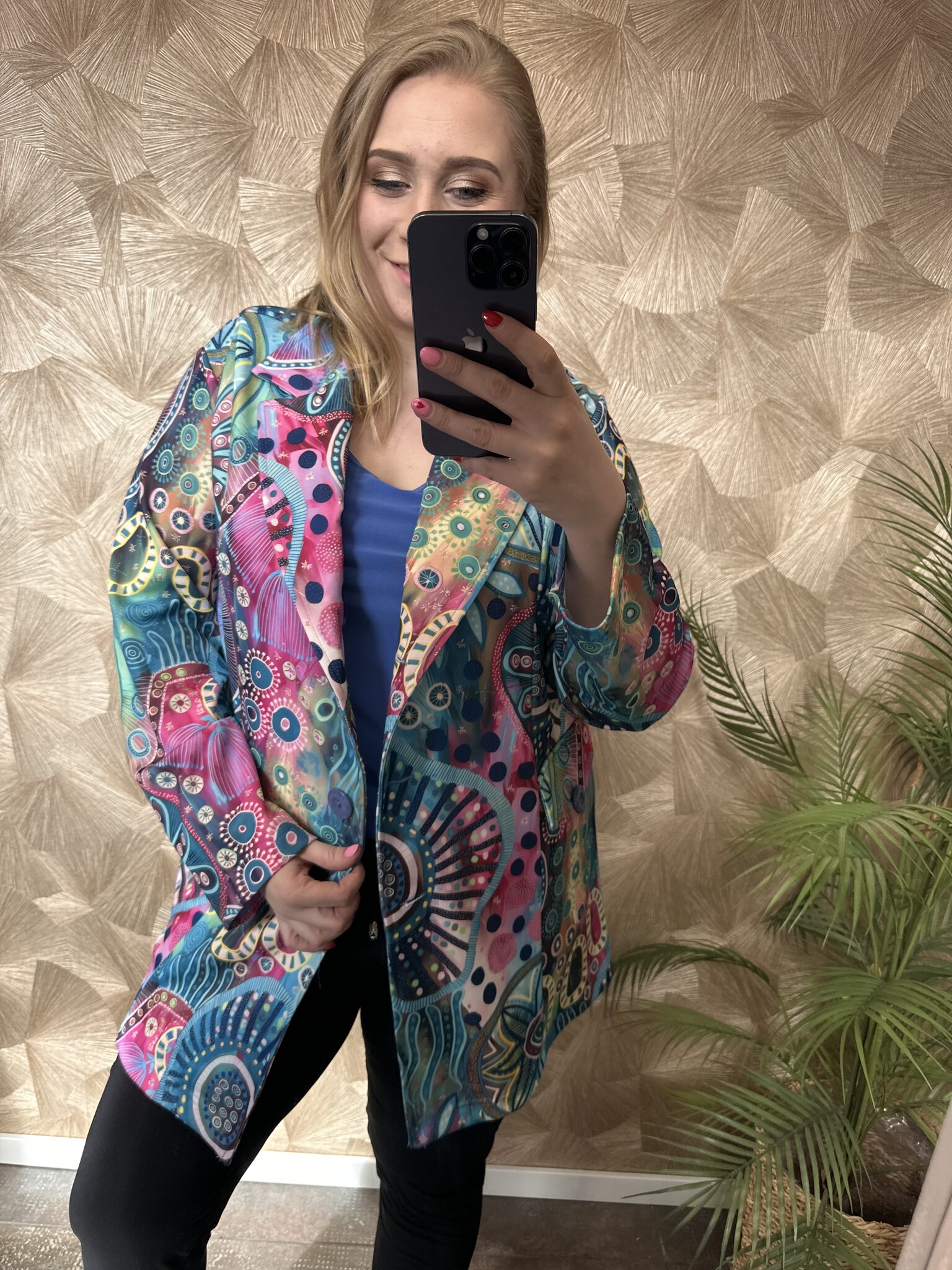 Deze blazer van Magna Fashion draagt elegant en heeft een losvallende pasvorm. De blazer heeft mooie kleuren met een speelse print. Gemaakt van een luchtige stof dat zorgt voor een fijn draagcomfort. De blazer is afgewerkt met een knoopsluiting, zakken op de voorkant met knopen en schoudervullingen. Een chique blazer die leuk te combineren is met een top!