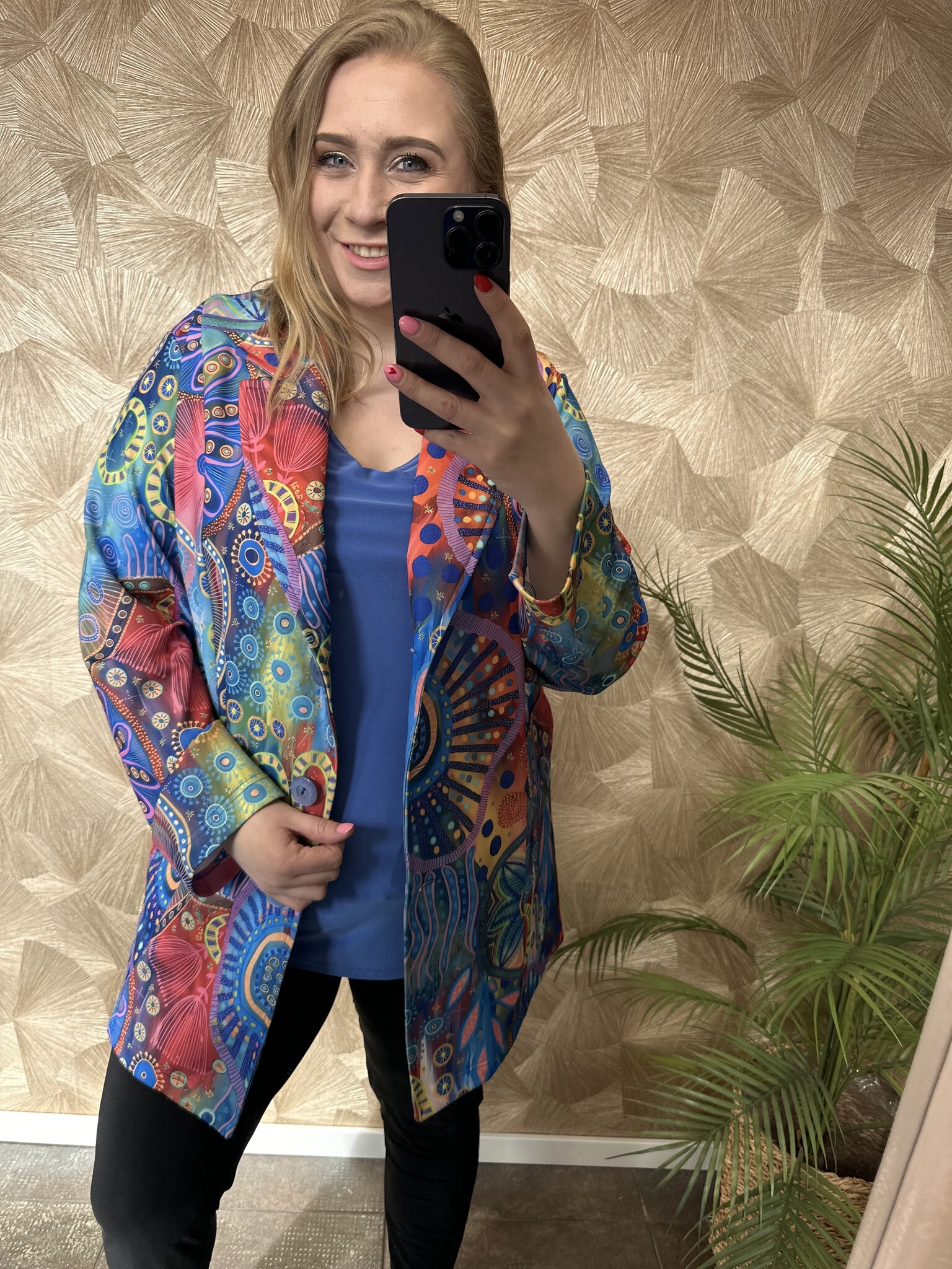 Deze blazer van Magna Fashion draagt elegant en heeft een losvallende pasvorm. De blazer heeft mooie kleuren met een speelse print. Gemaakt van een luchtige stof dat zorgt voor een fijn draagcomfort. De blazer is afgewerkt met een knoopsluiting, zakken op de voorkant met knopen en schoudervullingen. Een chique blazer die leuk te combineren is met een top!