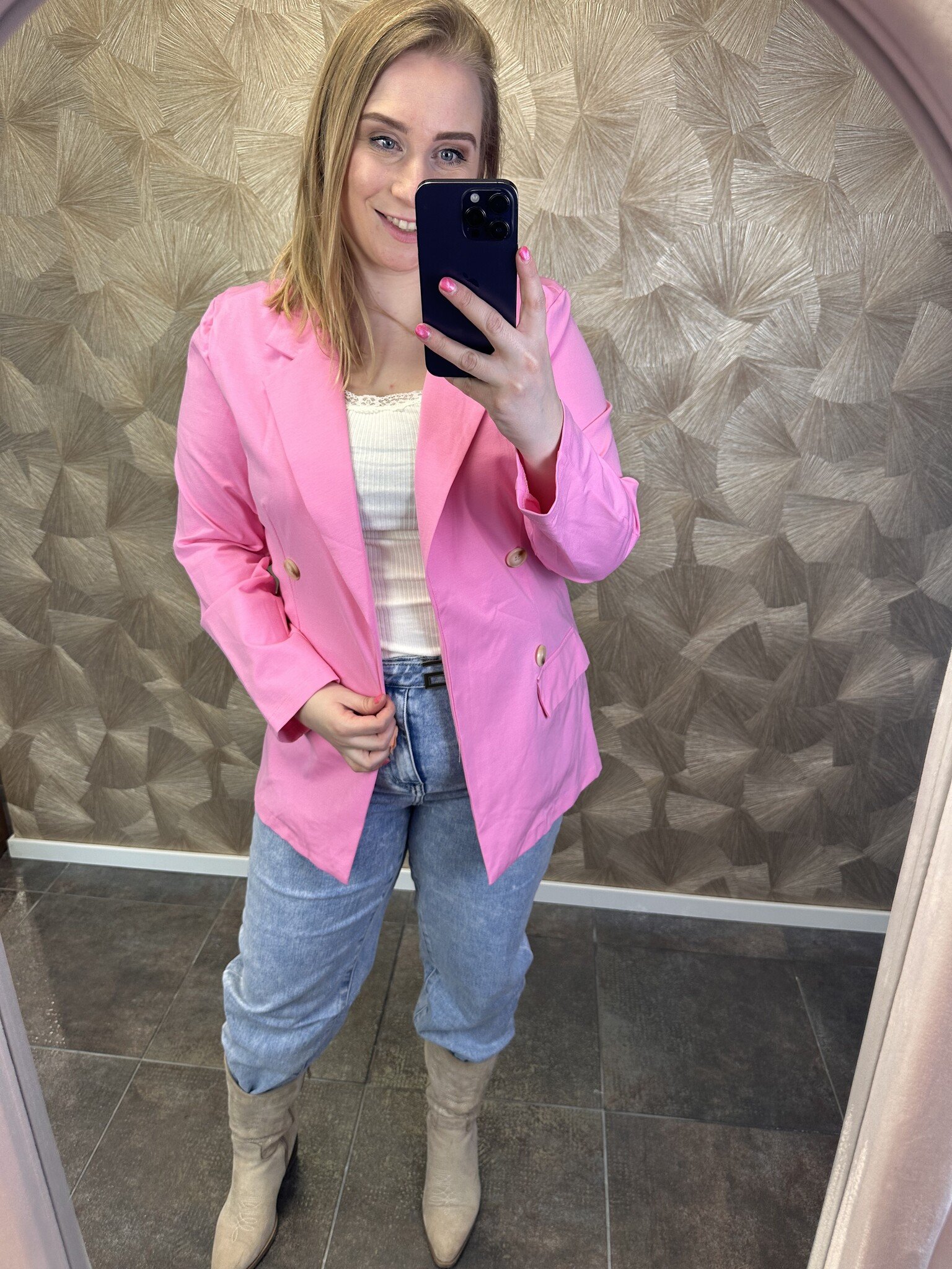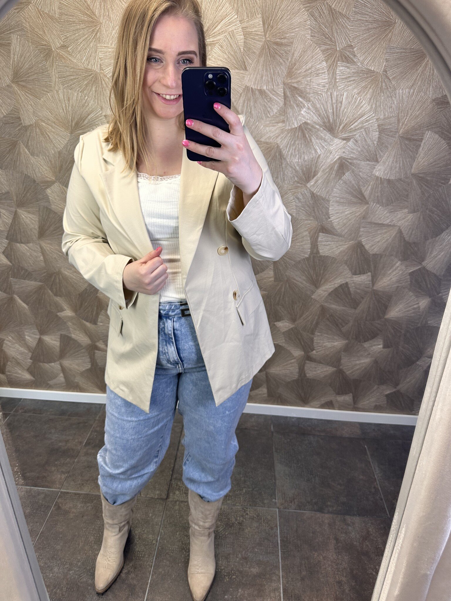 Deze super leuke blazer is een echte musthave voor je garderobe. Verkrijgbaar in stijlvolle kleuren: beige, zwart, vintage groen en roze. De neutrale en zachte tinten maken hem eindeloos combineerbaar, terwijl de leuke knoopjes net dat beetje extra detail geven waardoor hij extra charmant oogt.