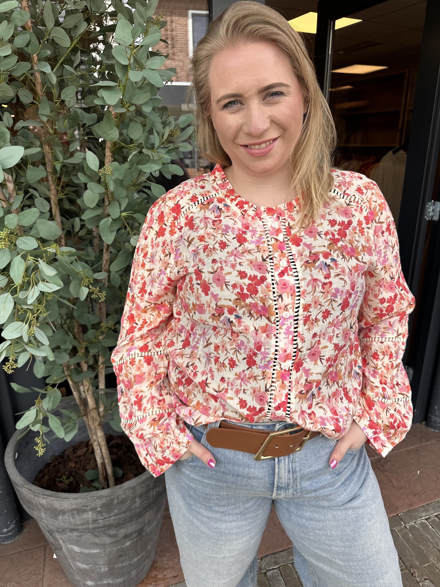 Mooie elegante blouse met verschillende tinten roze. Een leuk stukje broderie en een roezelige hals.