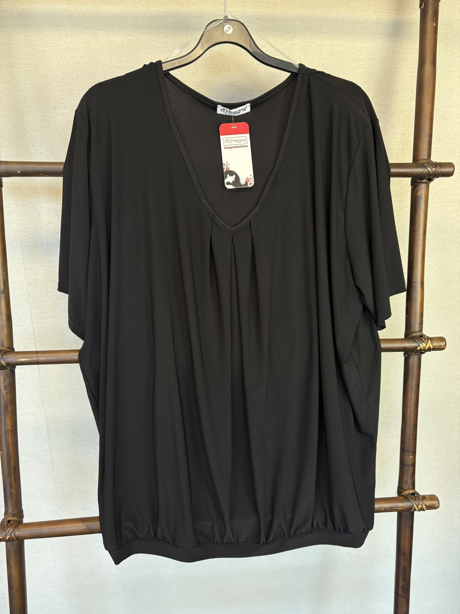 Deze zwarte blouse b-2103 van Magna Fashion zit comfortabel. De zwarte kleur geeft een mooie uitstraling. De luchtige stof voelt prettig aan en draagt comfortabel. Details: Diepe ronde hals en elastiek aan de onderzijde. Deze blouse staat altijd goed op een jeans.