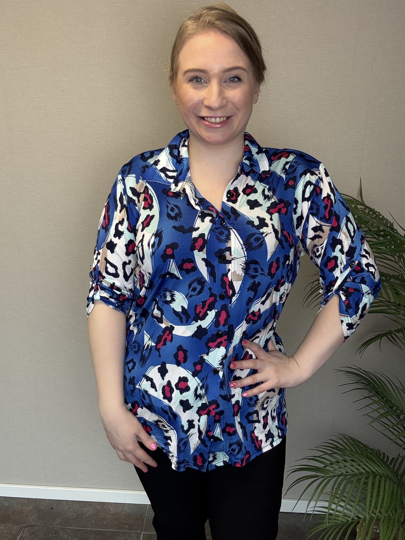 Deze B-2204 blouse van Magna Fashion valt op door de opvallende print met vele kleuren. Door de blauwe kleur met roze accenten is blouse Amber voor de vrouw die durft op te vallen! Amber is een doorgeknoopte blouse met een fijne ¾ mouw die op te stropen is. Een fijn model om zowel in het voorjaar als in de zomer te dragen.