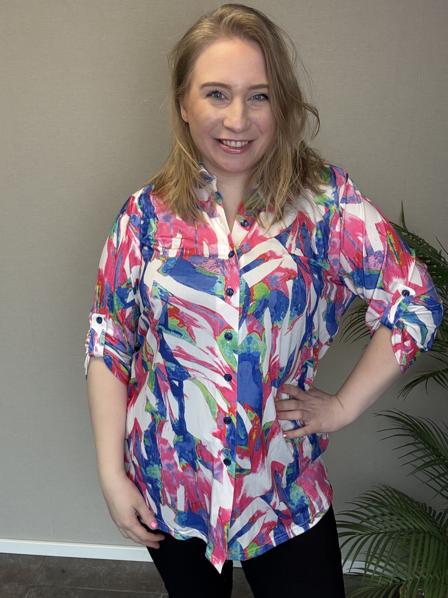 Deze B-2204 blouse Elin van Magna Fashion heeft ¾-mouwen die op te stropen zijn tot een luchtige mouw: perfect voor zowel het voorjaar als de zomer. Door de print met blauwe en roze accenten is het een elegante blouse waarmee je chique voor de dag komt.