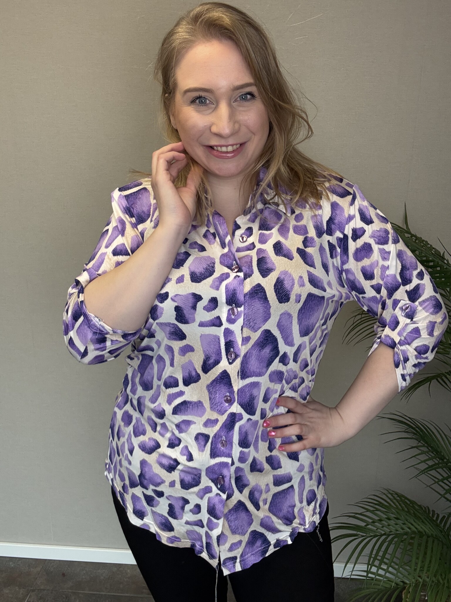 Blouse Giraffe van Magna Fashion in het model B-2204 is heeft ¾-mouwen die op te stropen zijn tot een luchtige mouw: perfect voor in het voorjaar en in de zomer. Deze elegante blouse met een giraffeprint in het wit met paars is perfect te stylen met een leuke paarse broek.