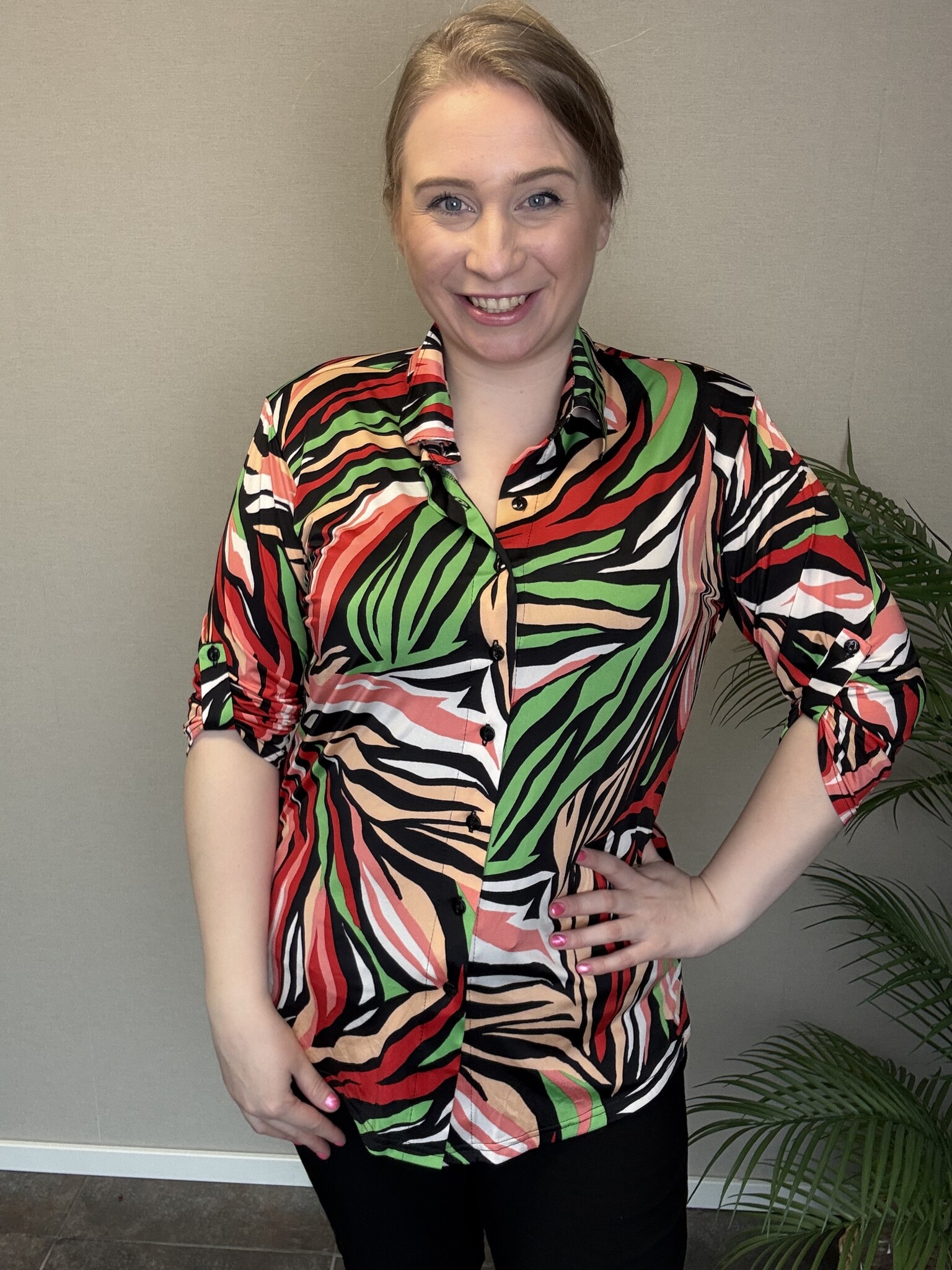 Blouse Isa is uitgevoerd in het B-2204 model van Magna Fashion, een zeer comfortabel model! De ¾-mouwen zijn op te stropen, waardoor dit model ideaal is om elegant voor de dag te komen in zowel het voorjaar als de zomer. Deze doorgeknoopte blouse heeft een mooie print met groene en roze accenten.