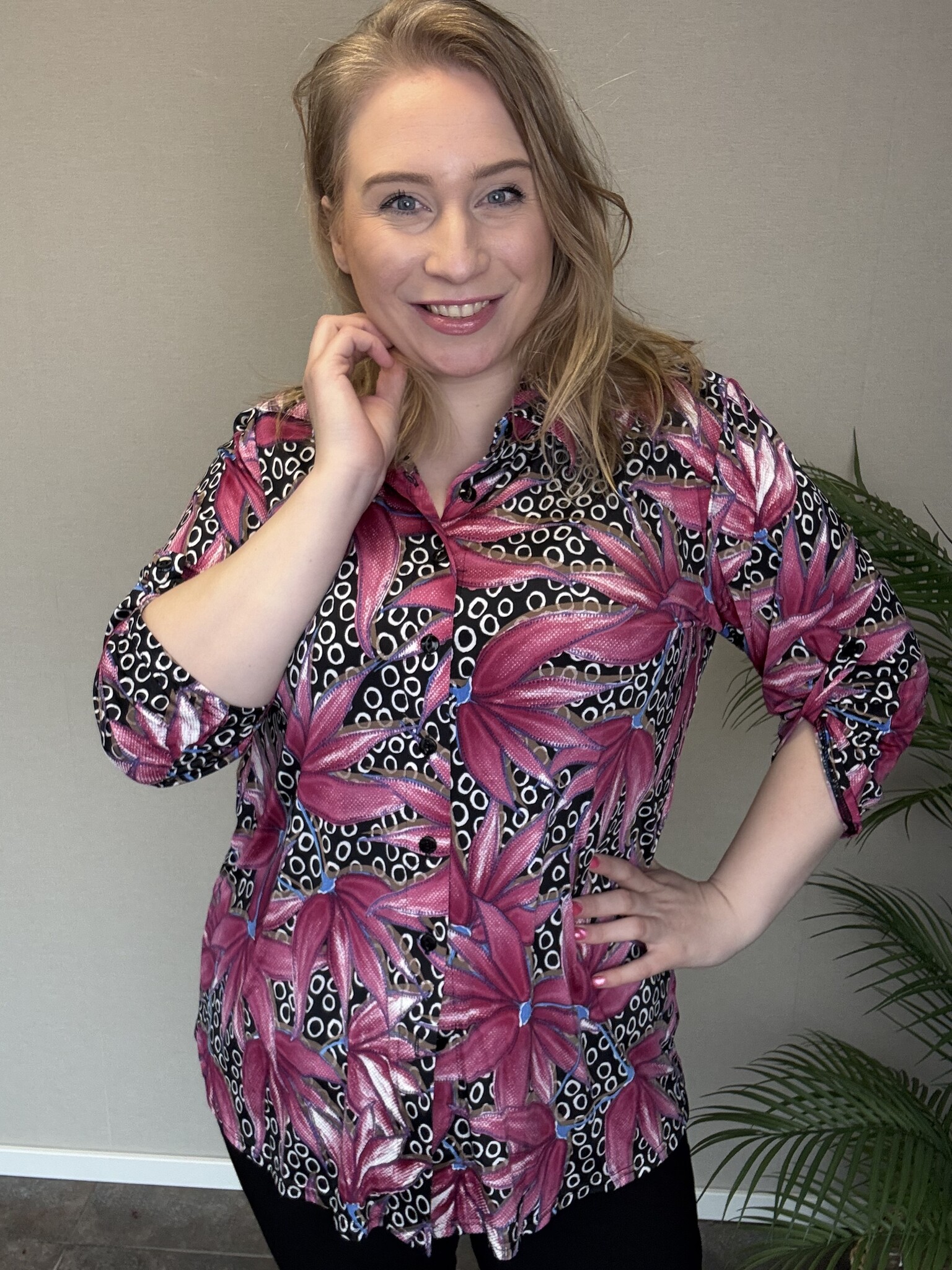 Blouse Julia is uitgevoerd in het B-2204 model van Magna Fashion en is een lange, comfortabele blouse. Julia is een doorgeknoopte blouse met een ¾ mouw en een mooie bloemenprint. Deze blouse is beschikbaar in fuchsia en kobalt. De mouwen van dit model zijn op te knopen, waardoor het een perfecte blouse is voor het voorjaar en de zomer.