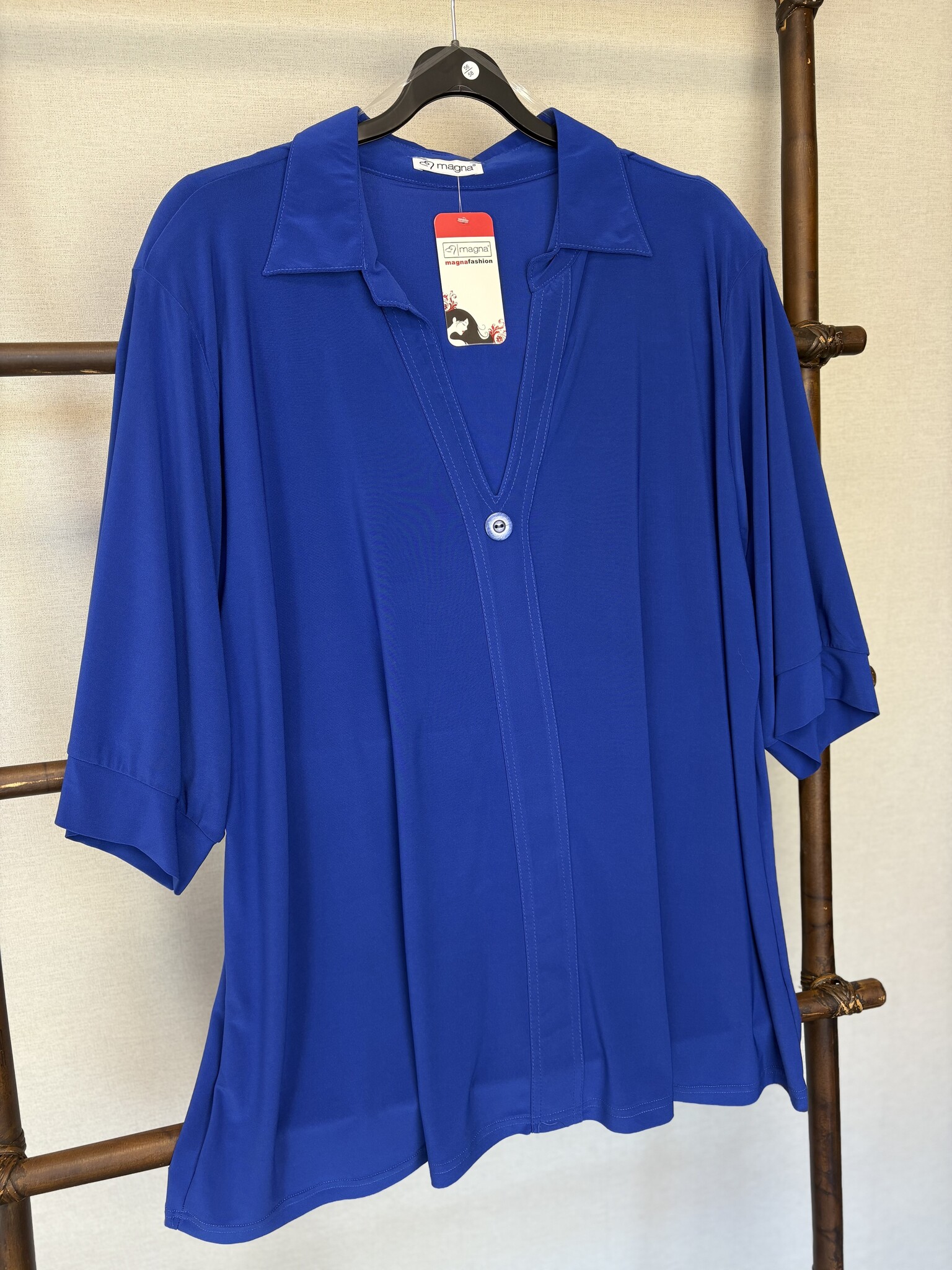Deze blouse van Magna Fashion valt mooi en heeft een losvallende pasvorm. De blouse is beschikbaar in meerdere kleuren. Gemaakt van een luchtige stof dat zorgt voor een fijn draagcomfort. De blouse is afgewerkt met een V-hals met een enkele knoopsluiting, schoudervullingen en een mooie strook aan de voorkant. Een casual chique blouse die leuk te combineren is met een broek!