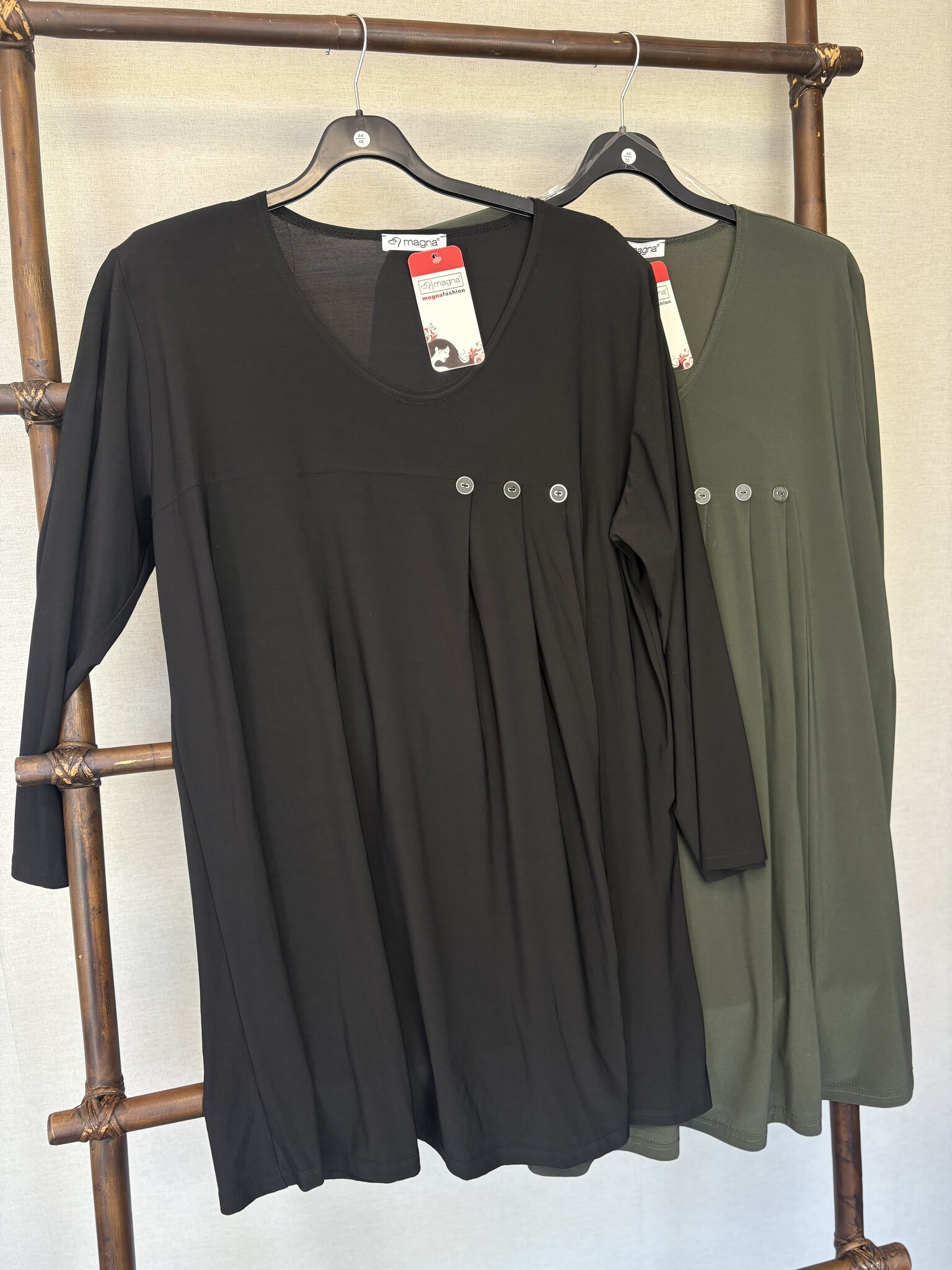 Deze tuniek van Magna Fashion valt mooi en heeft een losvallende pasvorm. De tuniek is beschikbaar in meerdere kleuren. Gemaakt van een luchtige stof dat zorgt voor een fijn draagcomfort. De tuniek is afgewerkt met een V-hals en leuke knopen op de borst die een plooiend effect creëren. Een casual chique tuniek die leuk te combineren is met een jeans!