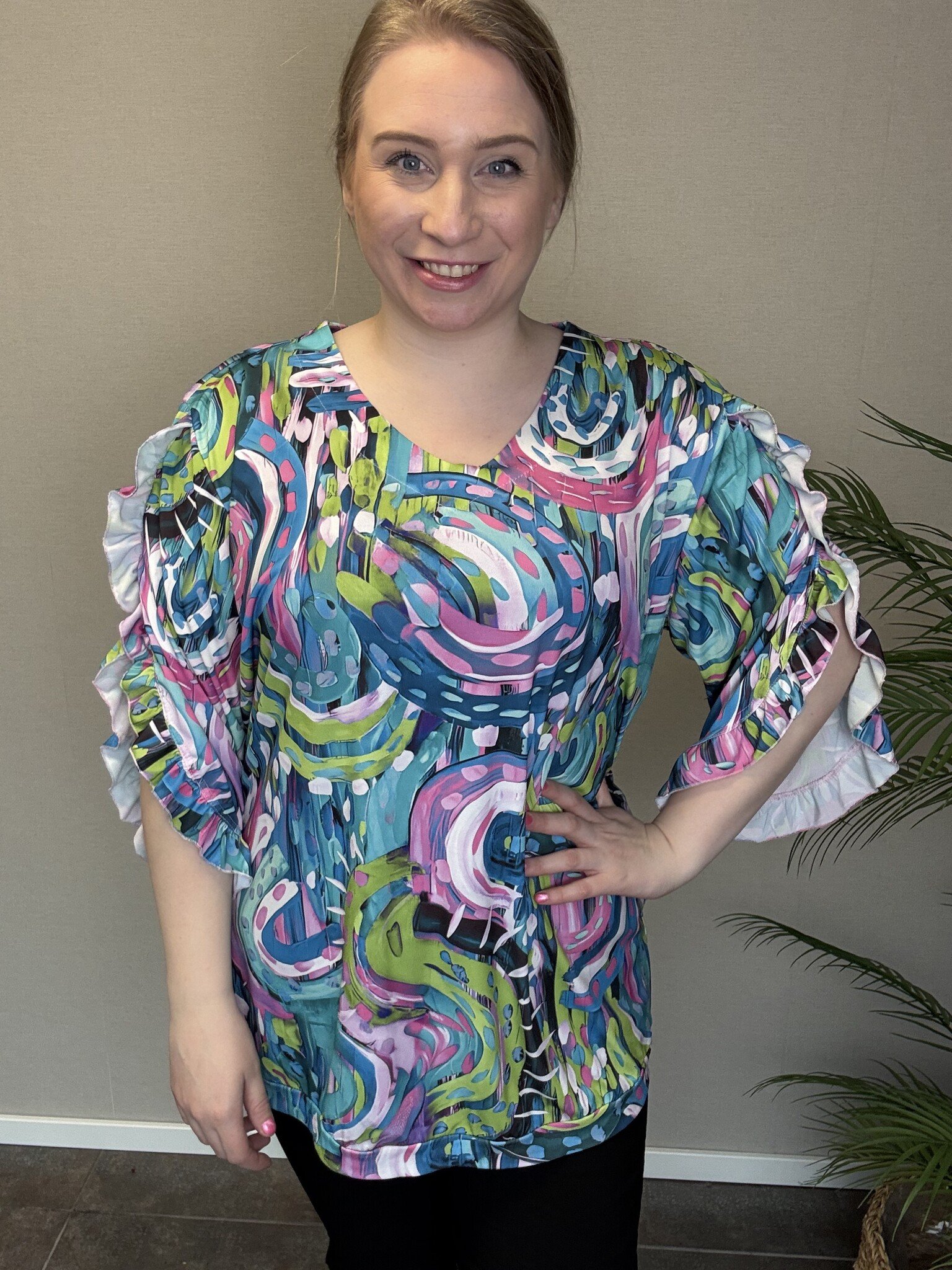 Een super leuk nieuw model van Magna Fashion! De B-2604 met super leuke roezel-mouwen. Nu ook in een geweldig patroon en vrolijke kleuren. Super tijdloos en leuk te combineren met andere basics uit onze collectie.