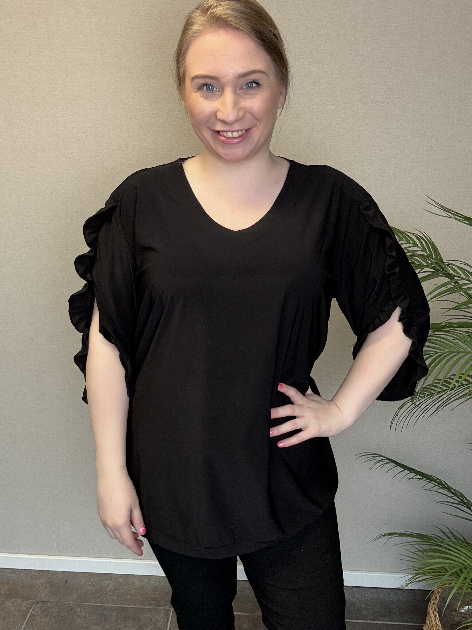 Een super leuk nieuw model van Magna Fashion! De B-2604 met super leuke roezel-mouwen. Deze basic kan je echt niet laten hangen! Kan niet ontbreken in je garderobe.