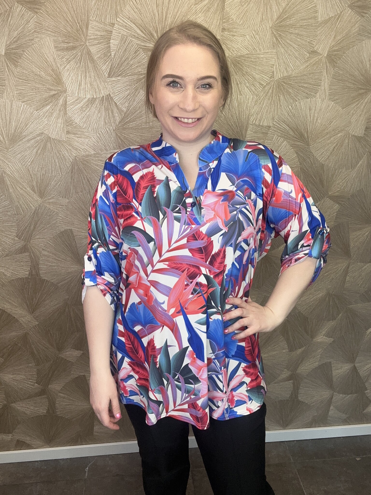 Deze blouse Elise van Magna Fashion heeft een bladerenprint met blauwe en rode bloemen. Het is een comfortabel model door de lange pasvorm en de ¾-mouwen die gemakkelijk op te knopen zijn. Deze blouse heeft een elegante V-hals en is leuk te combineren met een zwarte broek.