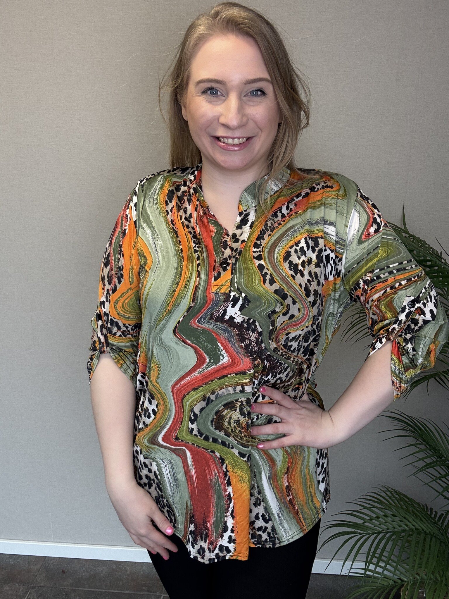 De B-9001 van Magna Fashion is een elegant tuniek met ¾ mouwen die makkelijk op te knopen zijn. Hierdoor is tuniek Emma perfect om te dragen in het voorjaar en in de zomer. Dit model heeft een V-hals die aan de onderkant vastzit met een knoopje. Emma heeft een mooie luipaard print met groene, rode en oranje accenten: ontzettend leuk om te dragen met bijvoorbeeld een groen jasje!