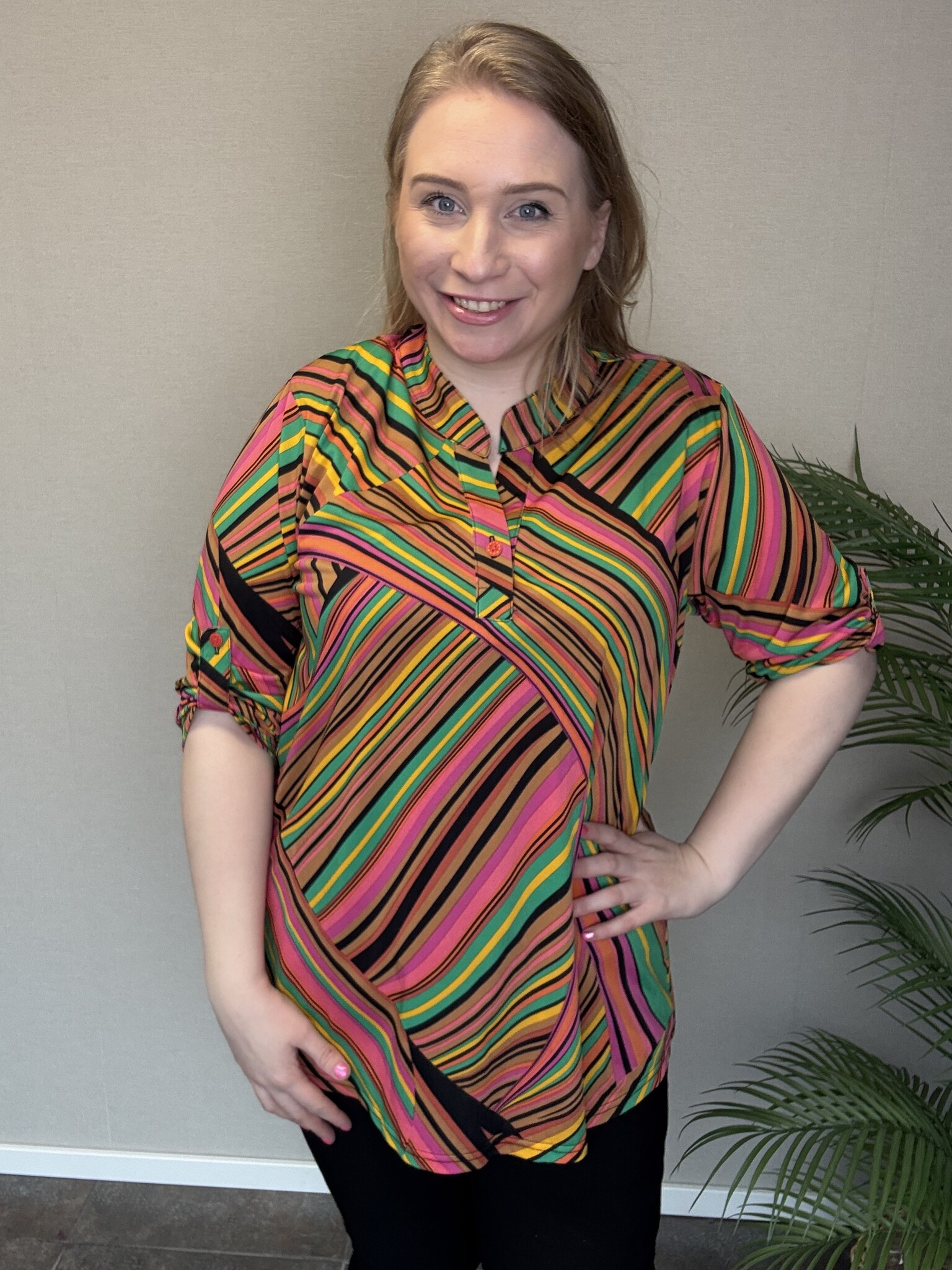 De B-9001 van Magna Fashion is een elegant blouse met ¾ mouwen die makkelijk op te knopen zijn. Hierdoor is blouse Esther perfect om te dragen in het voorjaar en in de zomeren zit ze door de stretchstof ontzettend comfortabel. Dit model heeft een V-hals die aan de onderkant vastzit met een knoopje. Dit tuniek heeft een mooie print met lijnen in verschillende kleuren.