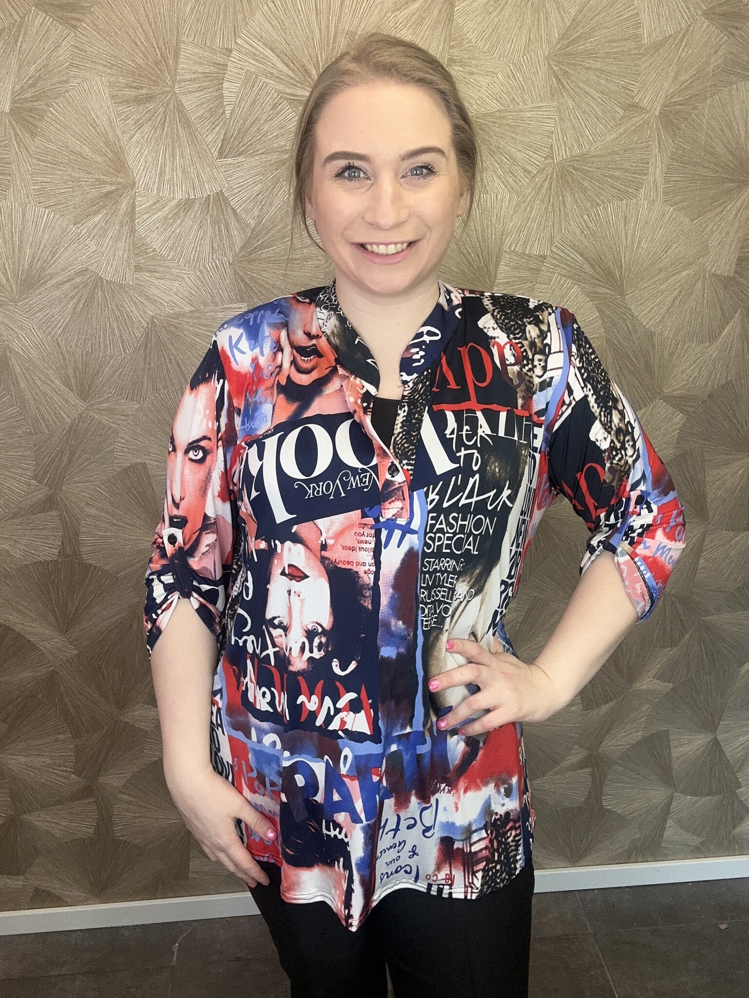 Blouse Ettie is door de Pop Art print een opvallend item in blauwe en rode kleuren. De blouse heeft een lang model met ¾-mouwen die makkelijk op te knopen zijn en een elegante V-hals. Heel leuk om te combineren met bijvoorbeeld een blauwe of rode broek!