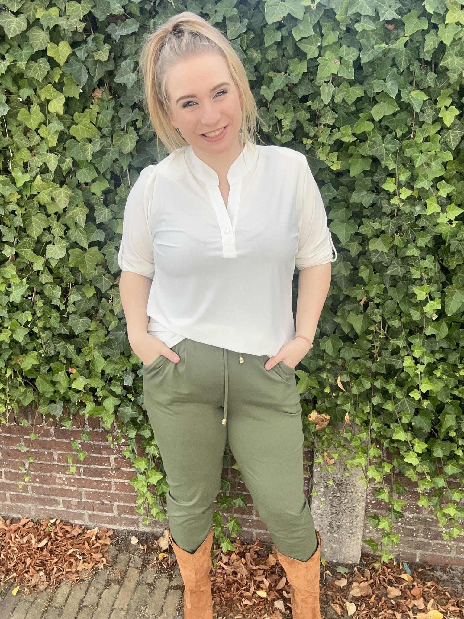 De blouse heeft een ophaal mouwtje & een V -hals. Valt goed op maat & is verkrijgbaar in vele kleuren & maten.