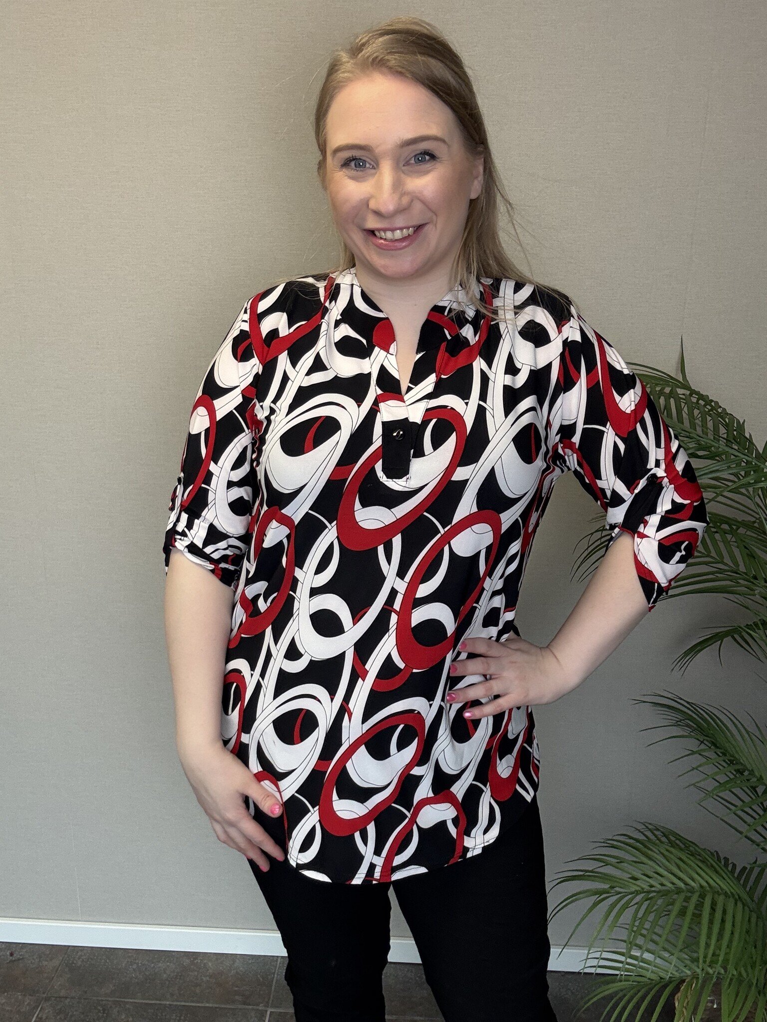 Blouse Suzanne van Magna Fashion heeft een lange, comfortabele pasvorm met ¾-mouwen die eenvoudig op te knopen zijn. De V-hals is afgewerkt met een subtiel knoopje onderaan. De zwarte basis gecombineerd met witte en rode vormen geeft dit model een stijlvolle uitstraling: perfect om elegant voor de dag te komen.
