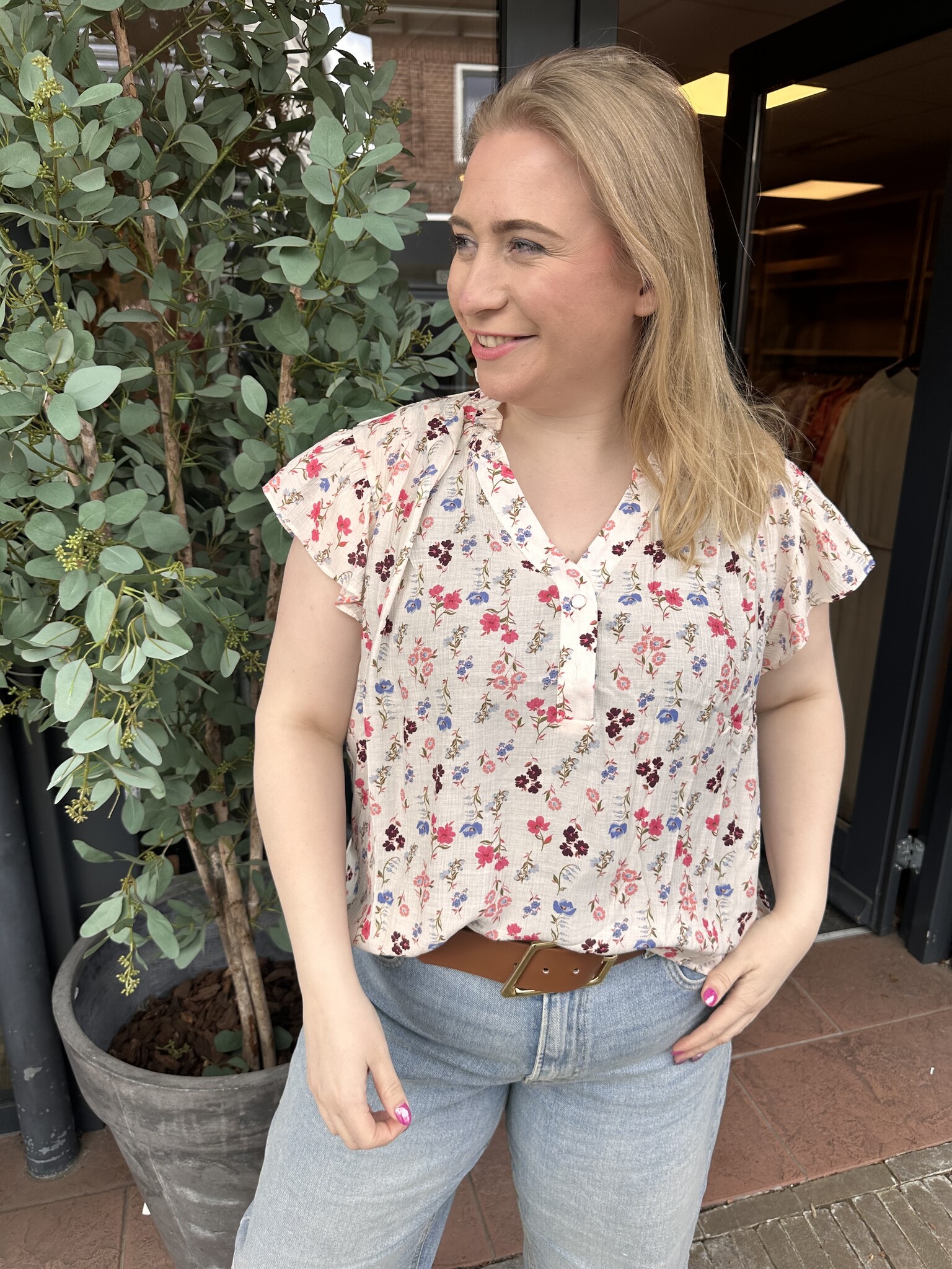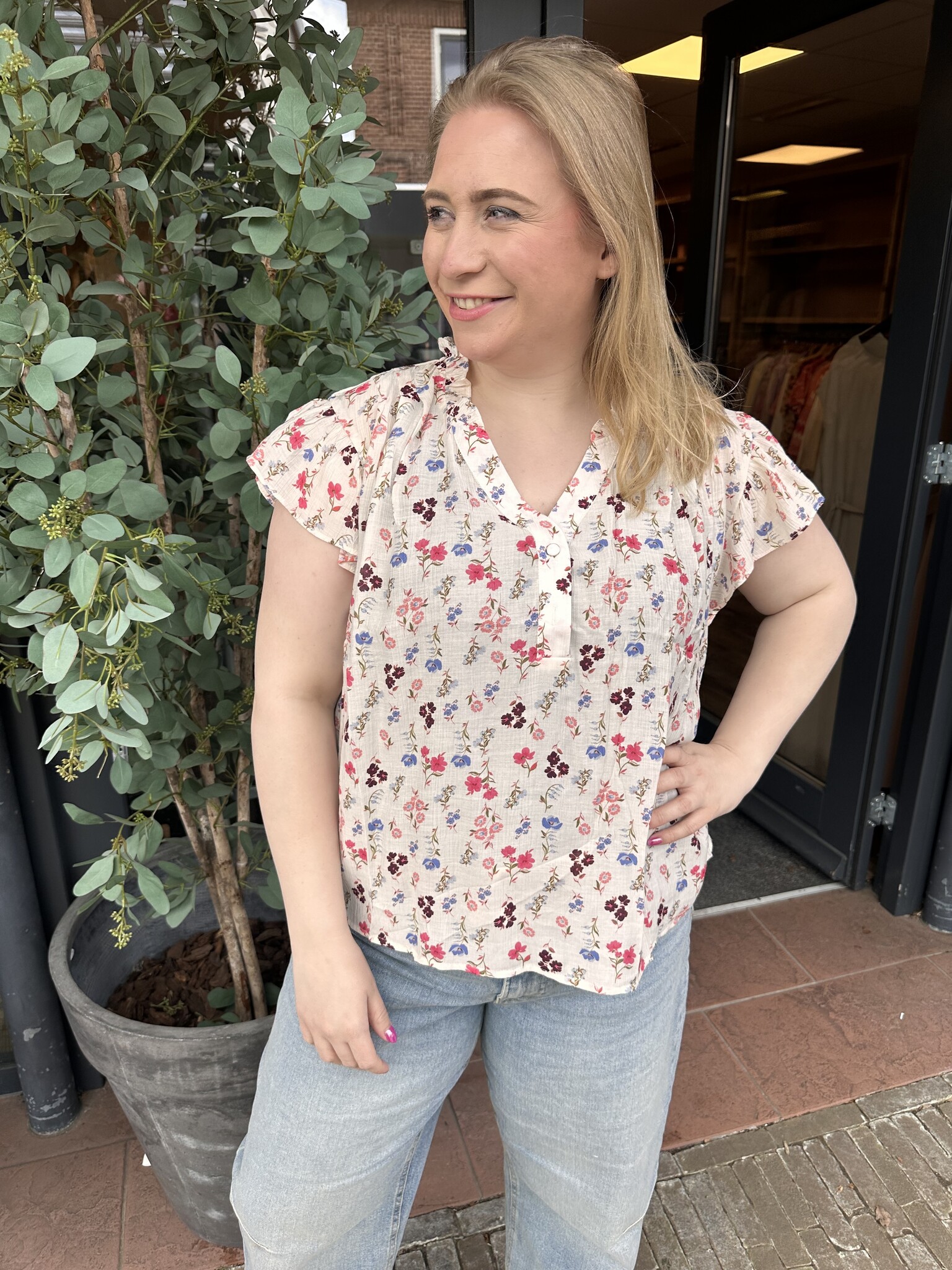Hoe vrolijk is deze leuke blouse! Wat een fleurige uitstraling geeft hij. Een mooie blouse voor het voorjaar met prachtige kleuren en een leuk kapmouwtje. Goed te combineren met een leuke jeans.
