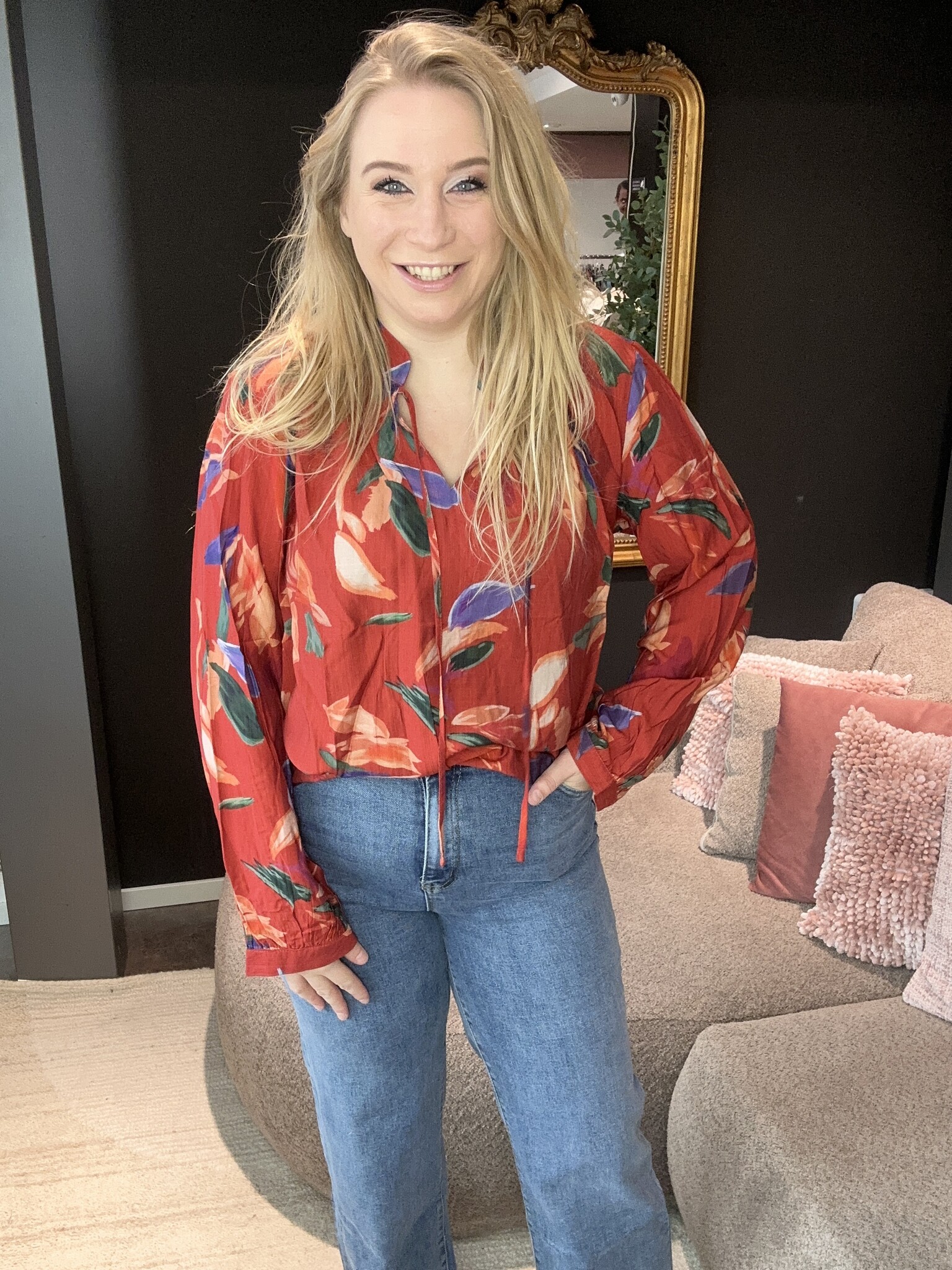Super mooie blouse van een hele fijne stof, uitgevoerd in een warme roestbruine kleur met een vrolijke print met allerlei andere kleuren. Met een strikdetail aan de hals welke je zowel los al vast kunt dragen. Valt goed maat.