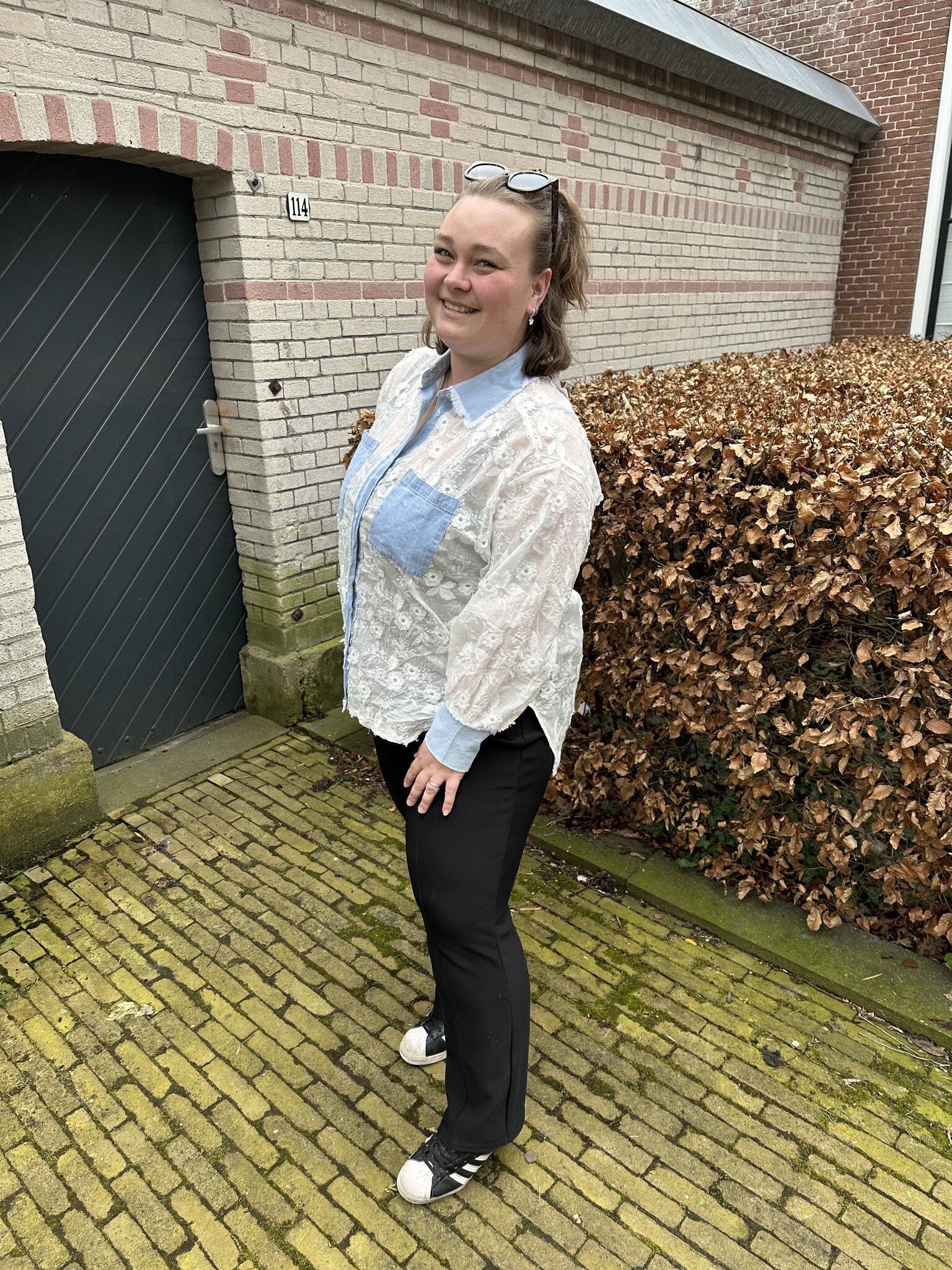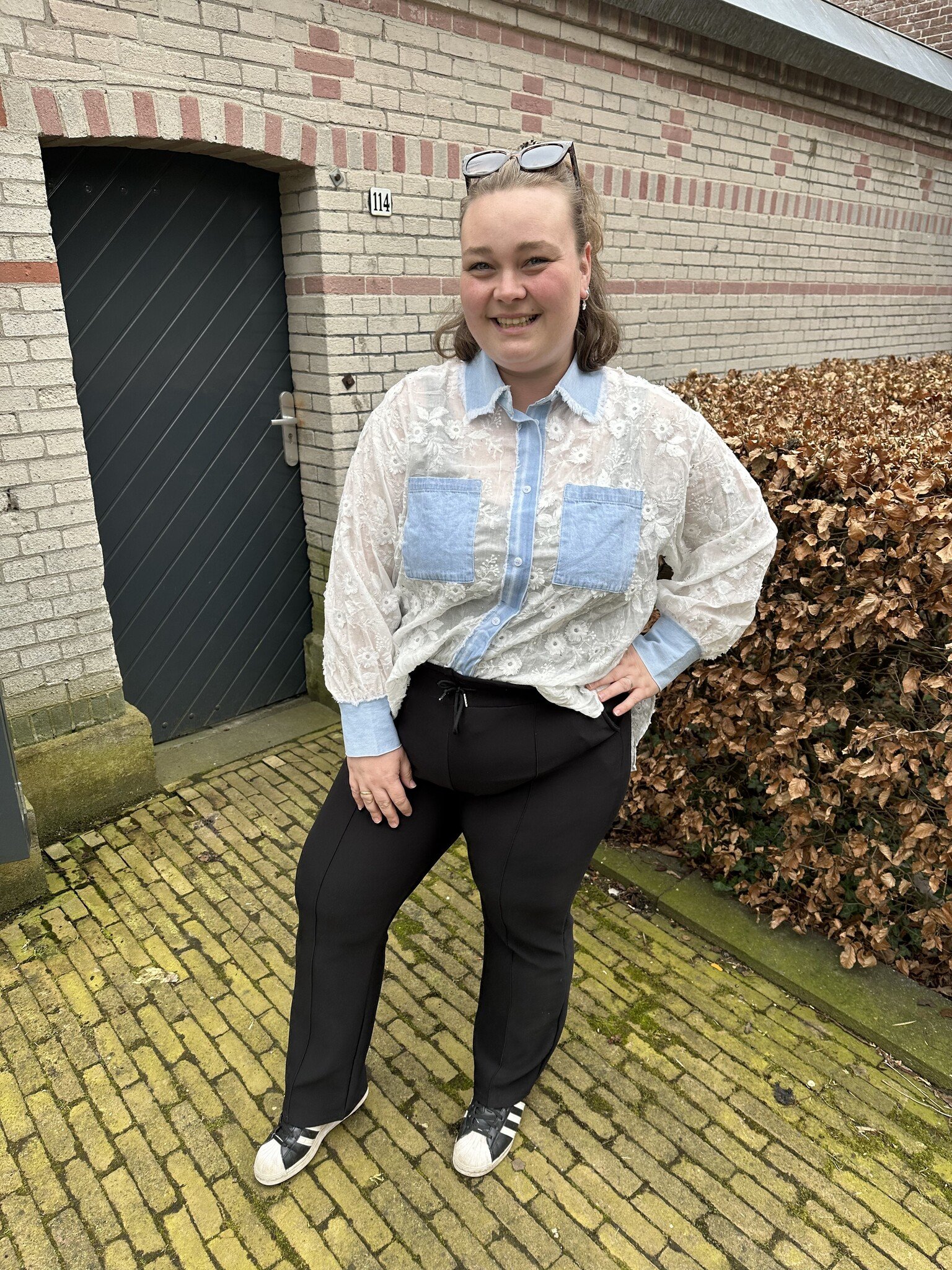 Deze witte blouse met accenten van denim is een speelse blouse! Gemaakt van een luchtige stof dat zorgt voor een fijn draagcomfort. De blouse is afgewerkt met kanten details, een knoopsluiting en leuke zakken op de borst.