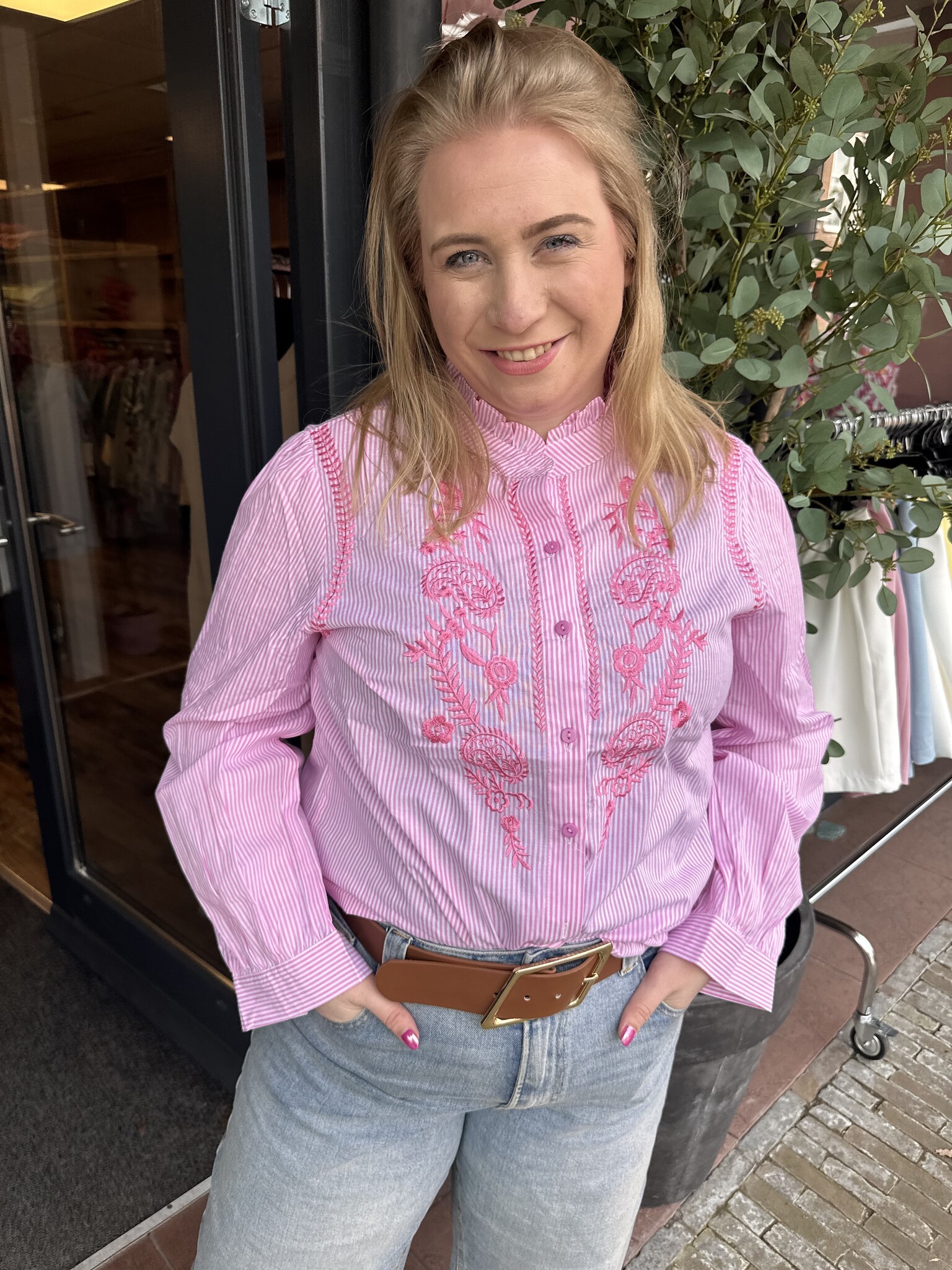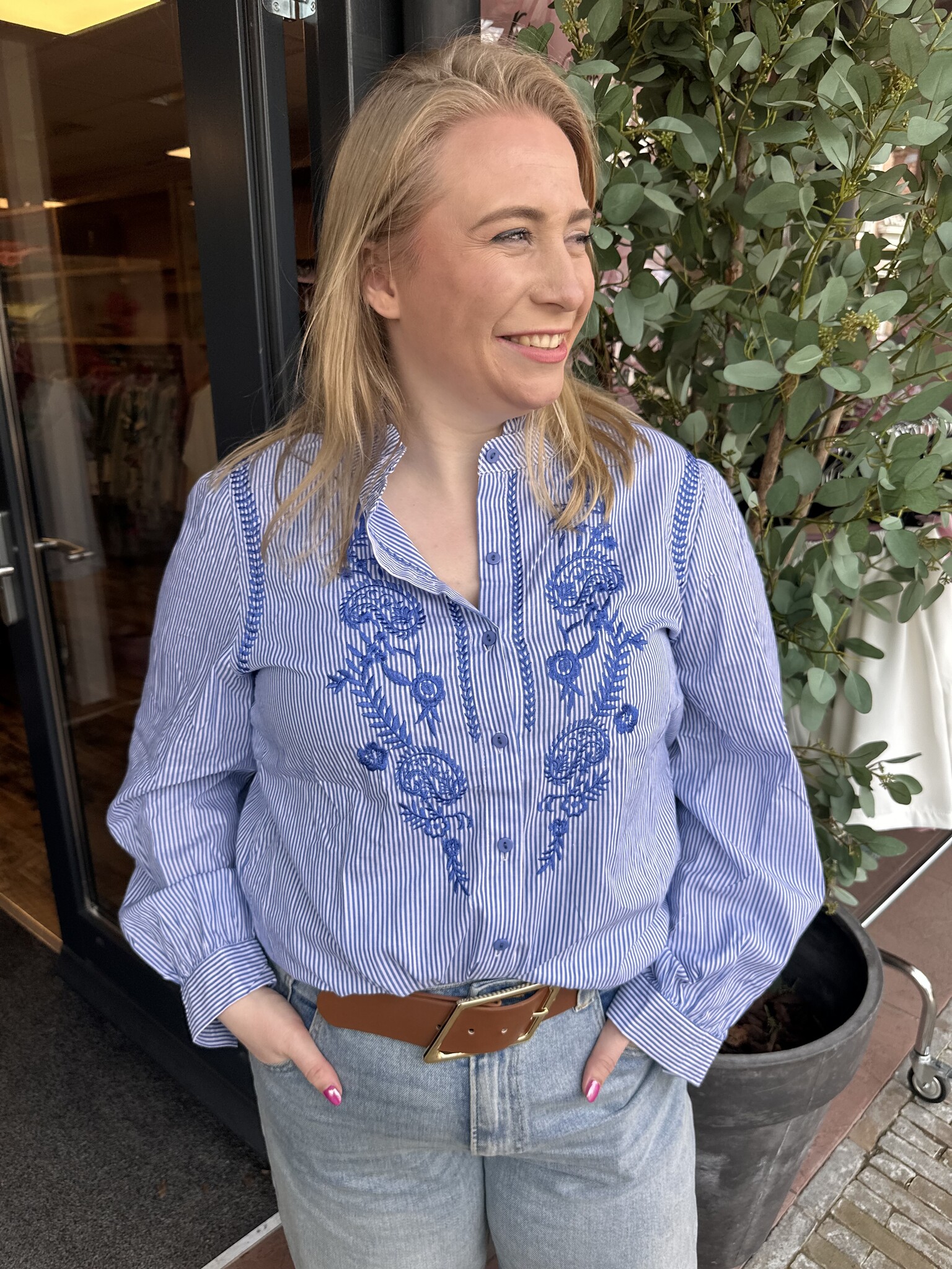 Dit is echt een hele mooi blouse in 2 verschillende kleuren. In het blauw en in het roze. Met een prachtig geborduurd stuk aan de voorzijde. Dit zorg voor een heel romantisch en elegante look.