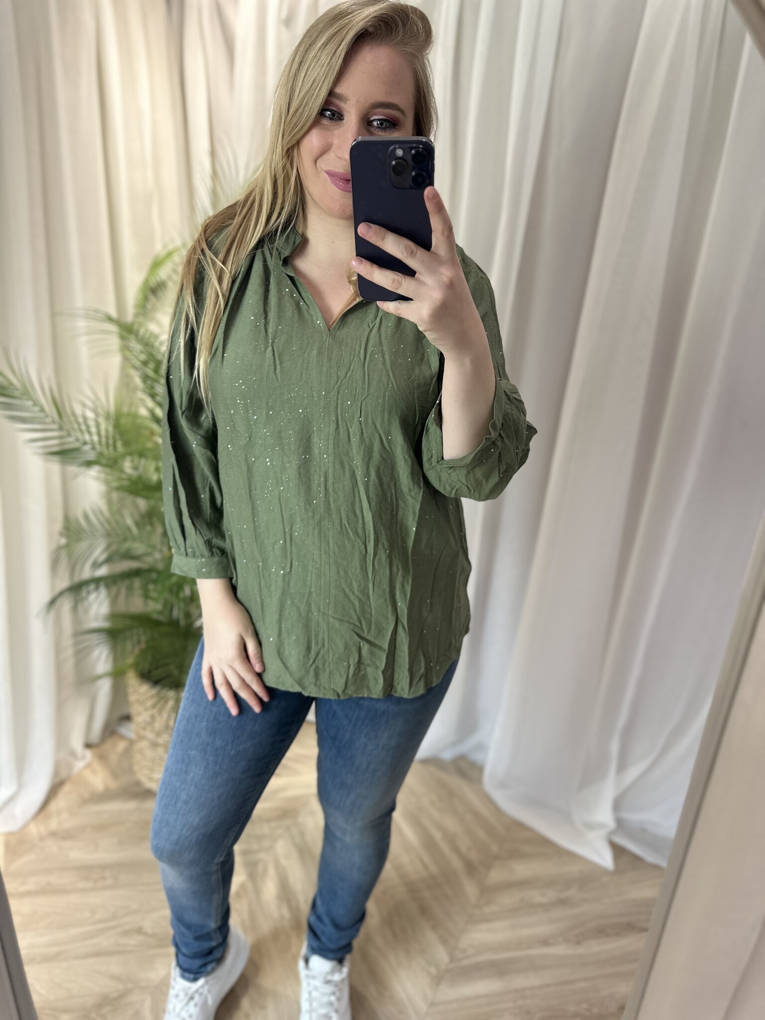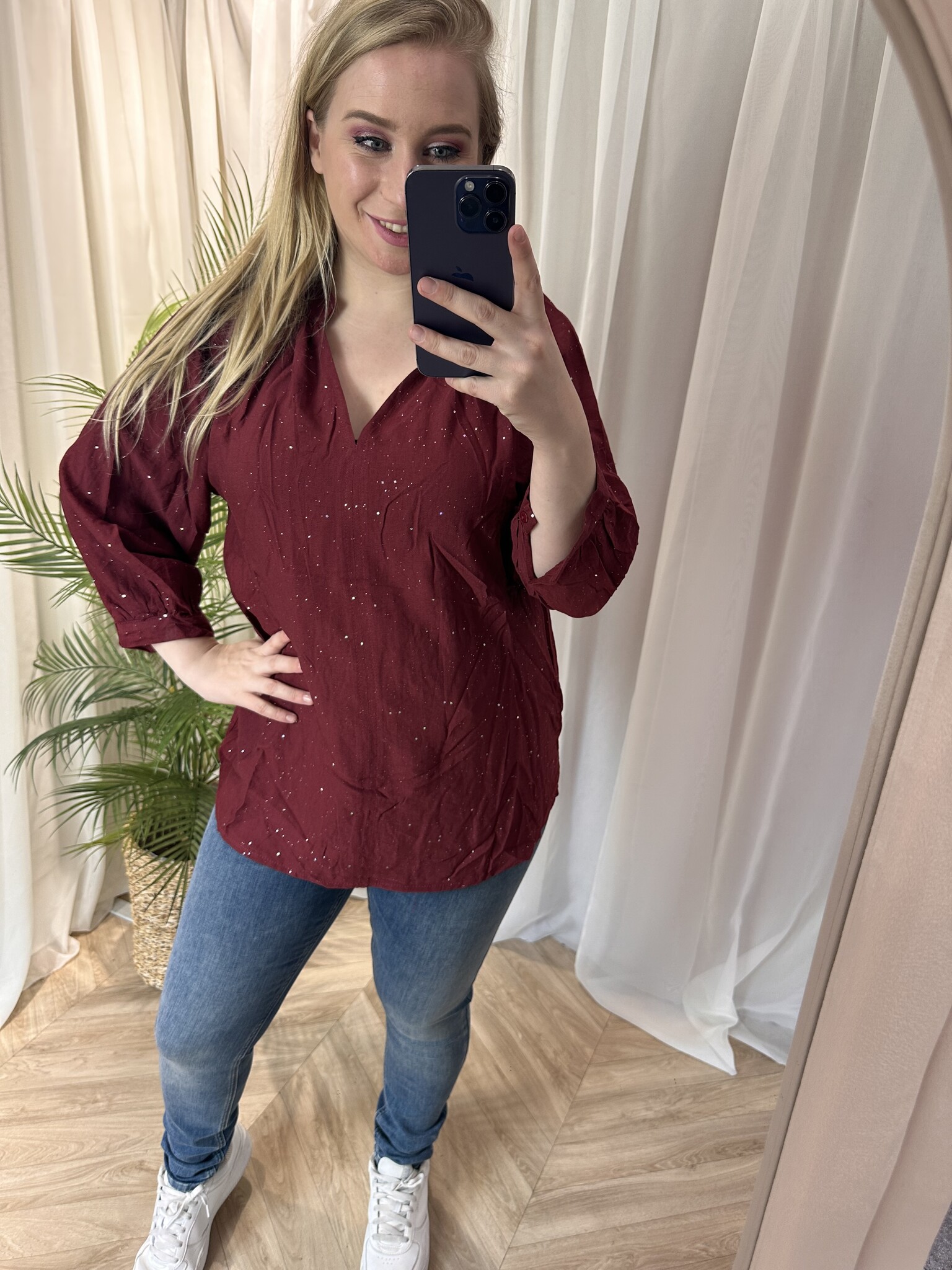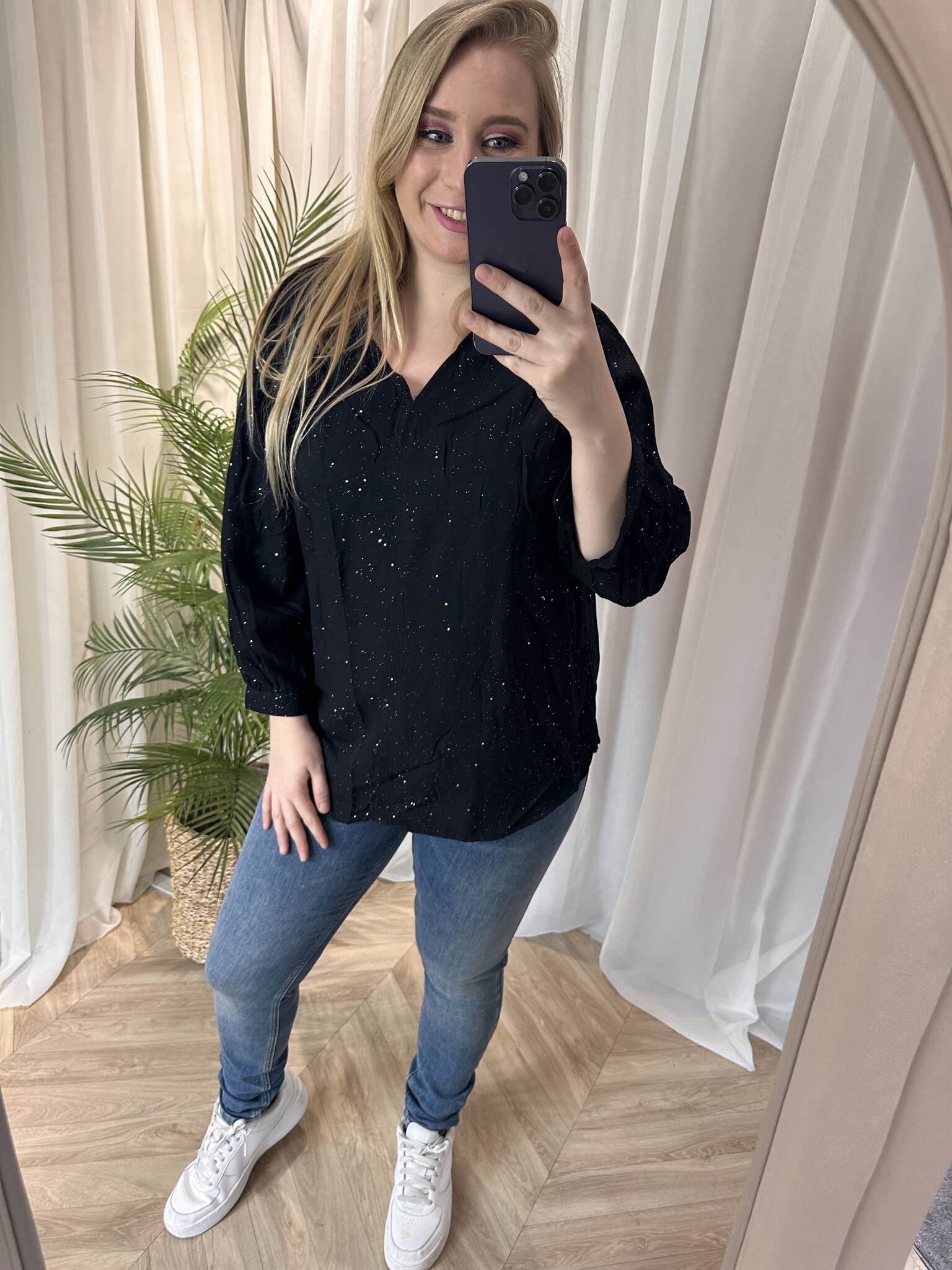 Prachtige blouse met een leuke glitter! Valt goed op maat.