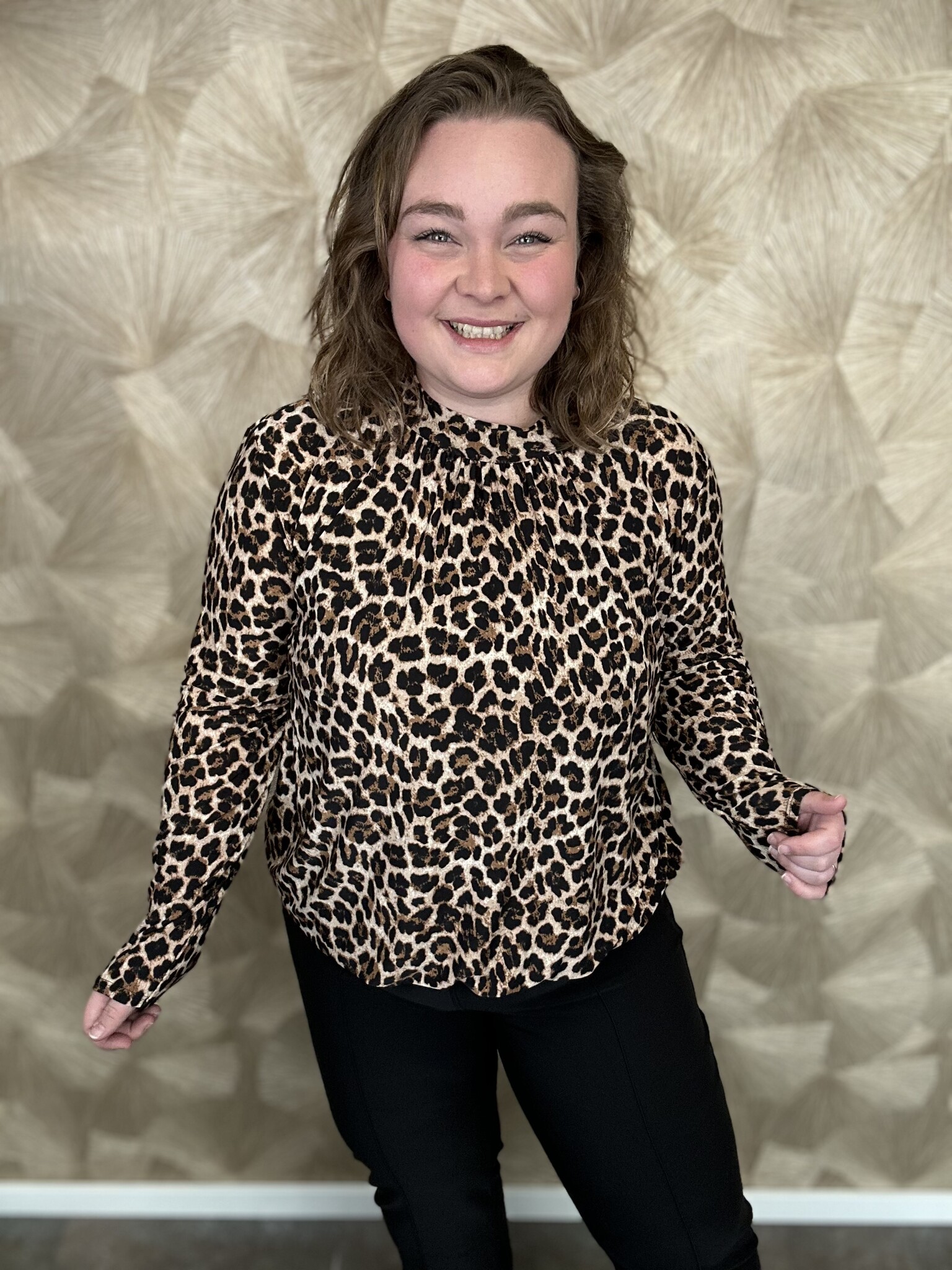 Beautyvol - Deze trendy ballonblouse met panterprint heeft een subtiel ballon-effect aan de onderkant, wat zorgt voor een speels en flatterend silhouet. De kleine turtleneck geeft de blouse een elegante uitstraling, terwijl de soepele stof comfortabel draagt.