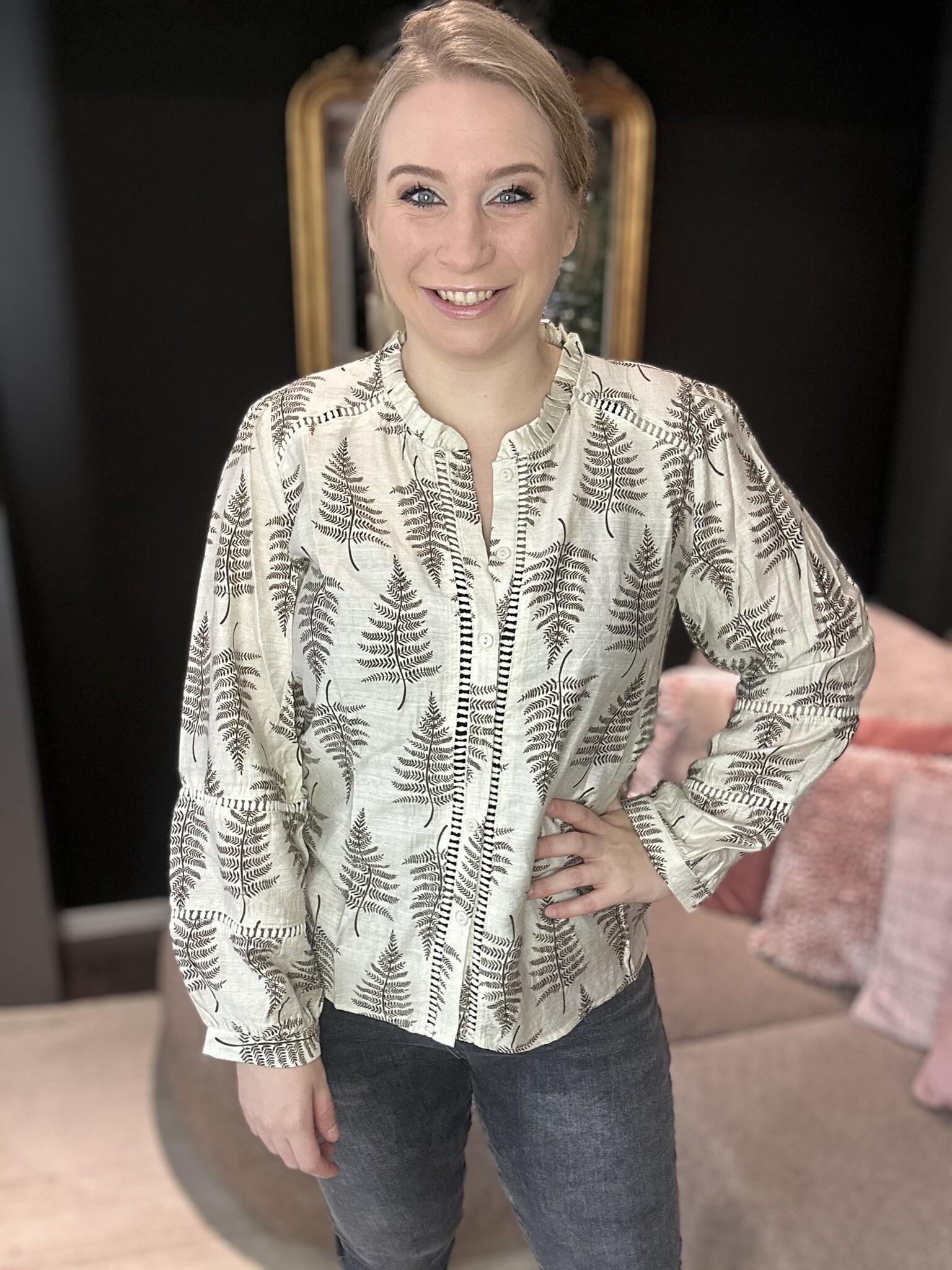 Super mooie blouse van een hele fijne stof, uitgevoerd in off-white kleur met een donkerbruine print. Valt goed maat.