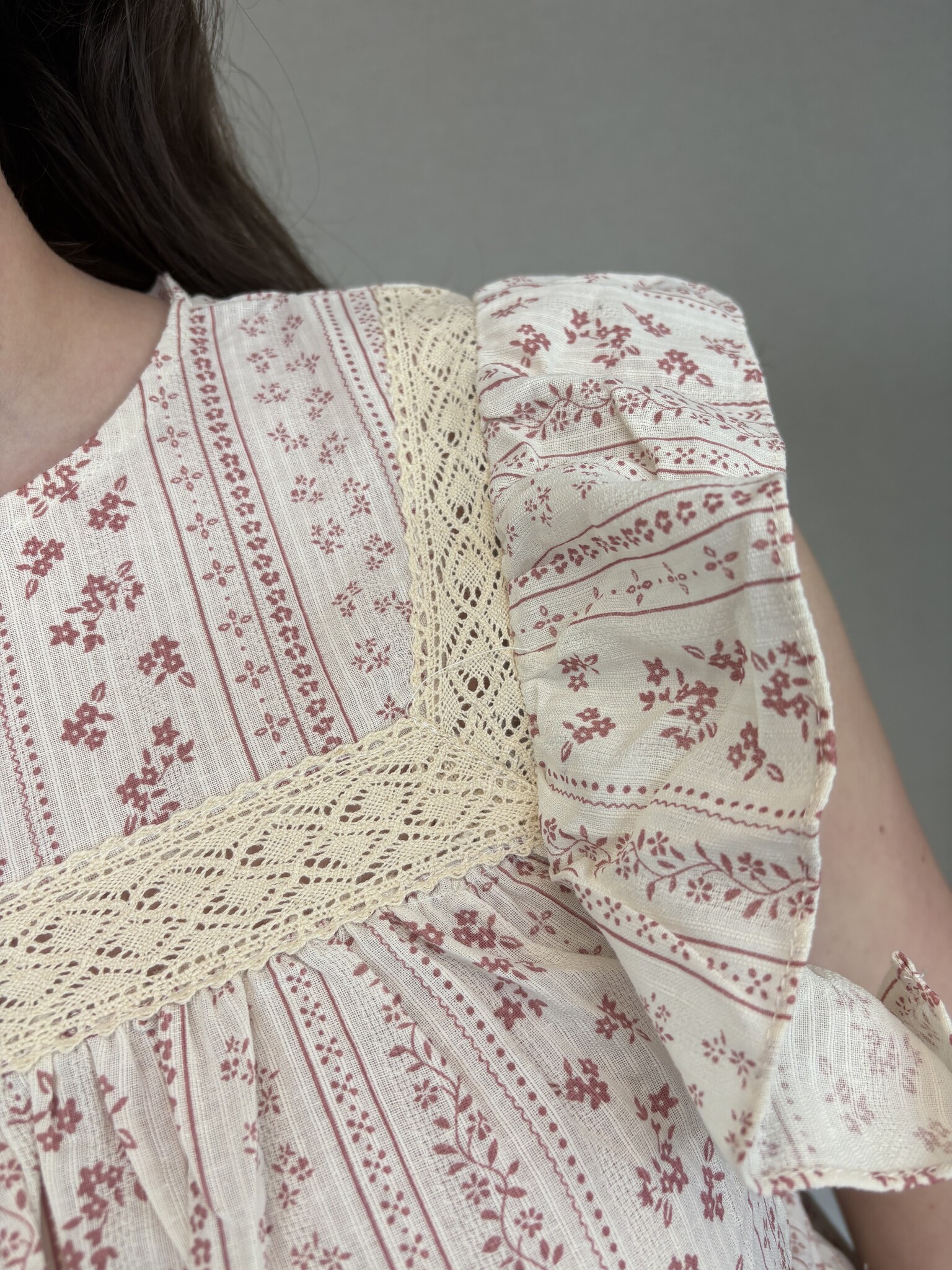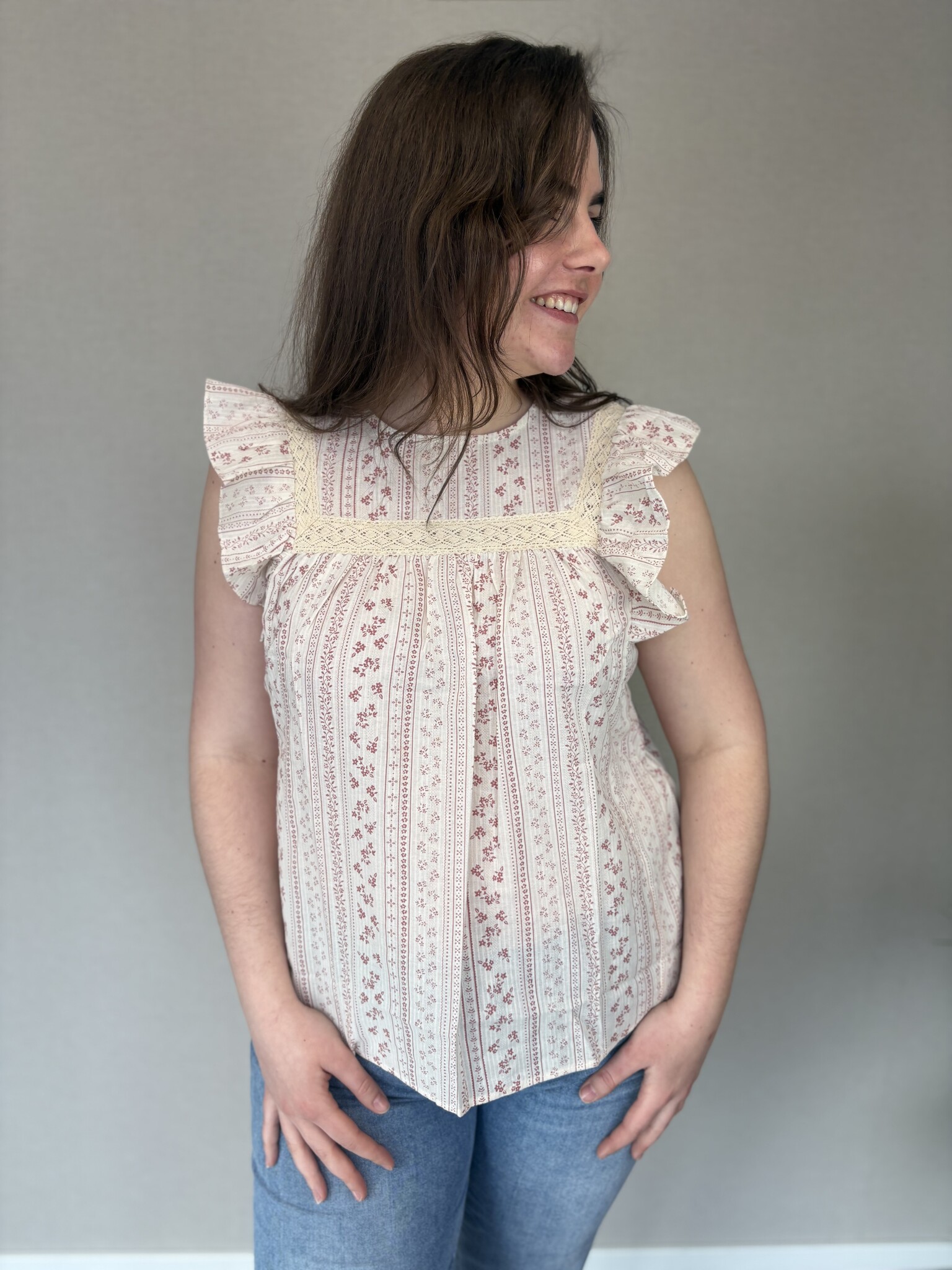 Een hele leuke en lieflijke blouse. Zo leuk voor het mooie weer. De blouse heeft een kapmouwtje en stukjes broderie.