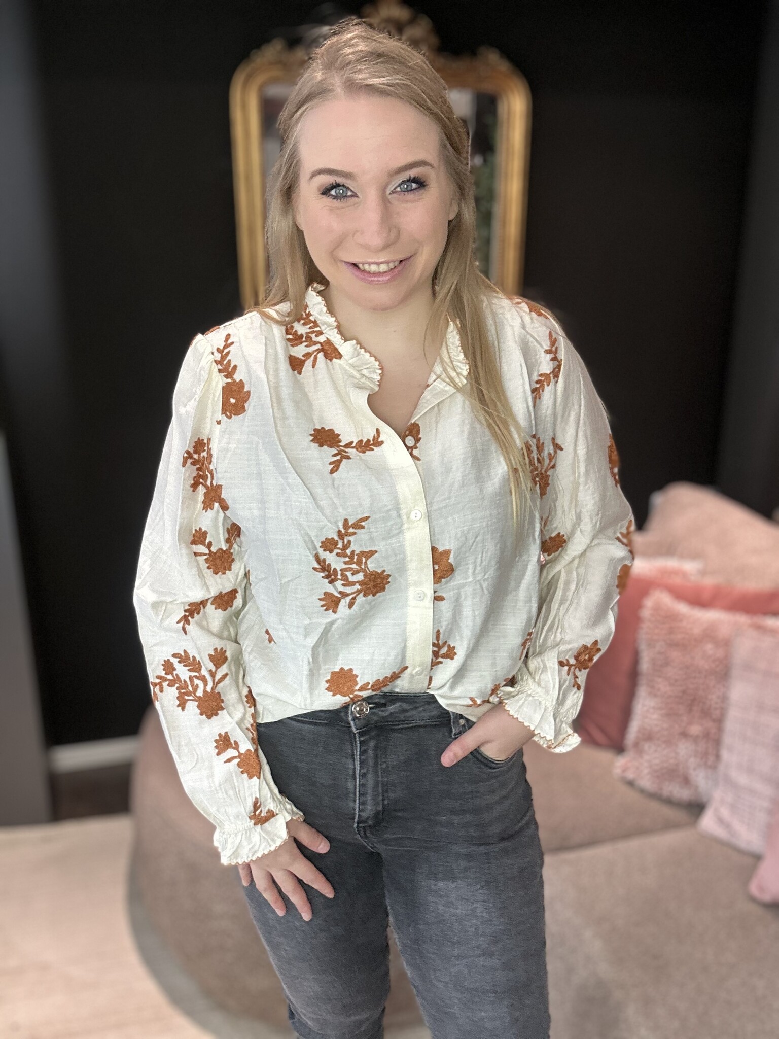 Prachtige blouse van een hele fijne stof, uitgevoerd in een off-white kleur met een super mooi okergoud bloemen borduursel met een klein roeseltje aan de mouw & aan de halslijn. Valt goed maat.