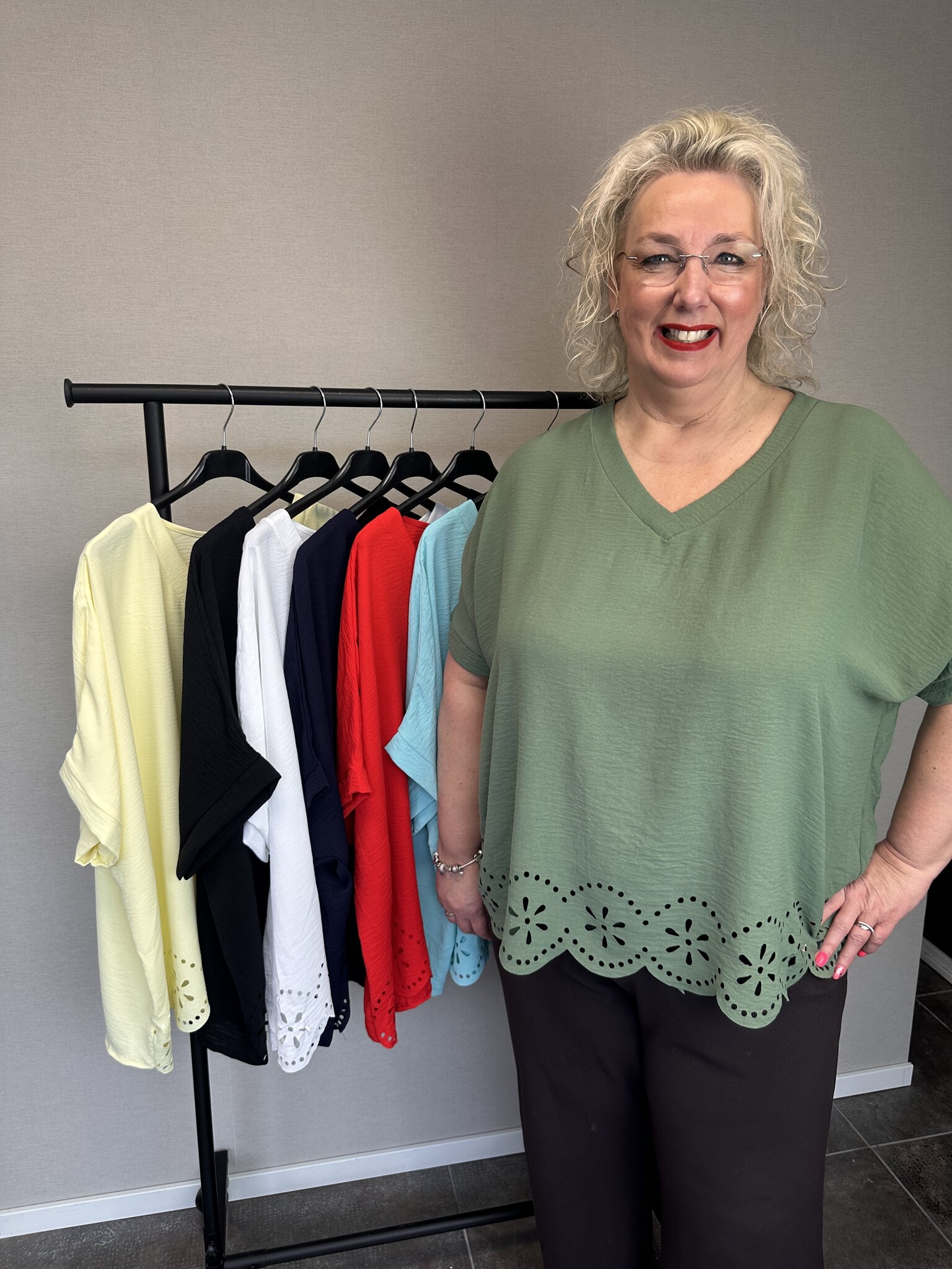 Deze blouse van Beautyvol valt mooi en heeft een ruimvallende pasvorm. De blouse is beschikbaar in meerdere kleuren. Gemaakt van een luchtige stof dat zorgt voor een fijn draagcomfort. De blouse is afgewerkt met een V-hals, vleermuis-mouwen en een broderie-look rand. Een casual chic blouse die leuk te combineren is met een jeans!