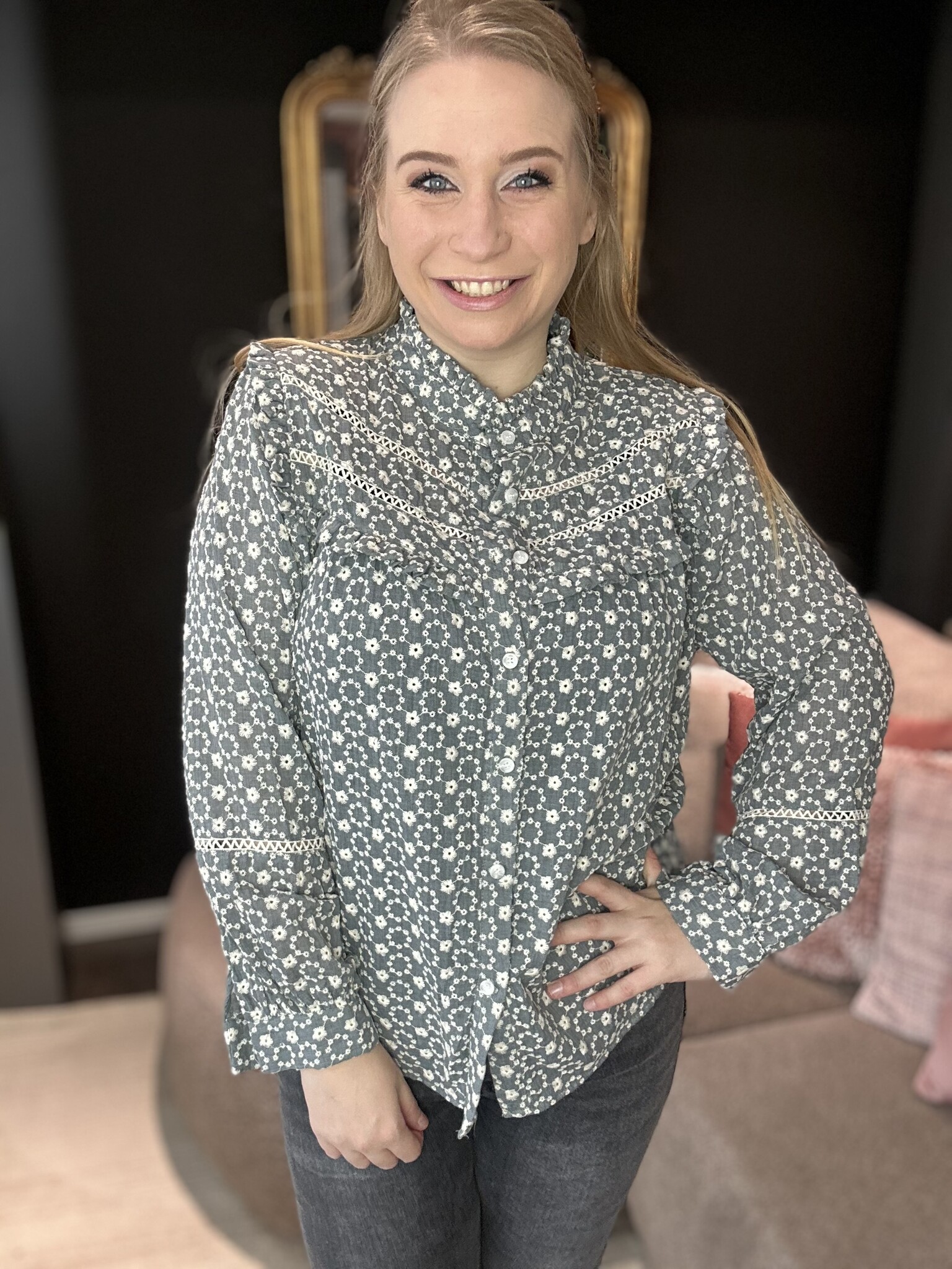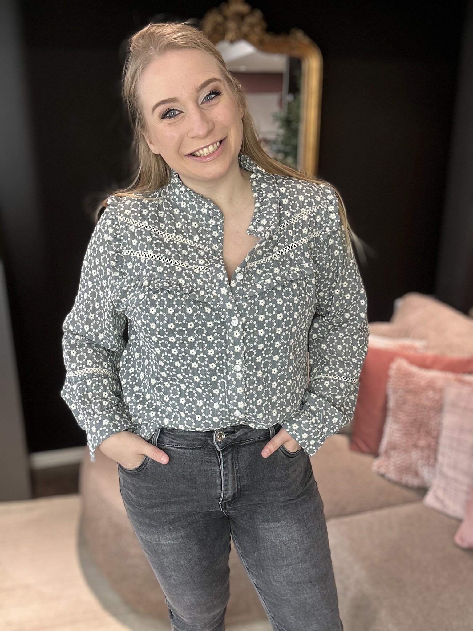 Super mooie blouse van een hele fijne stof, uitgevoerd in een warme groengrijze kleur met een prachtig fijn borduursel met een klein roeseltje aan de mouw & aan de halslijn. Valt goed maat.