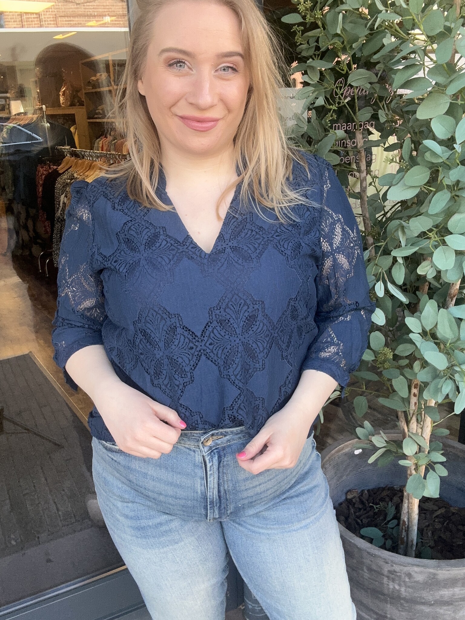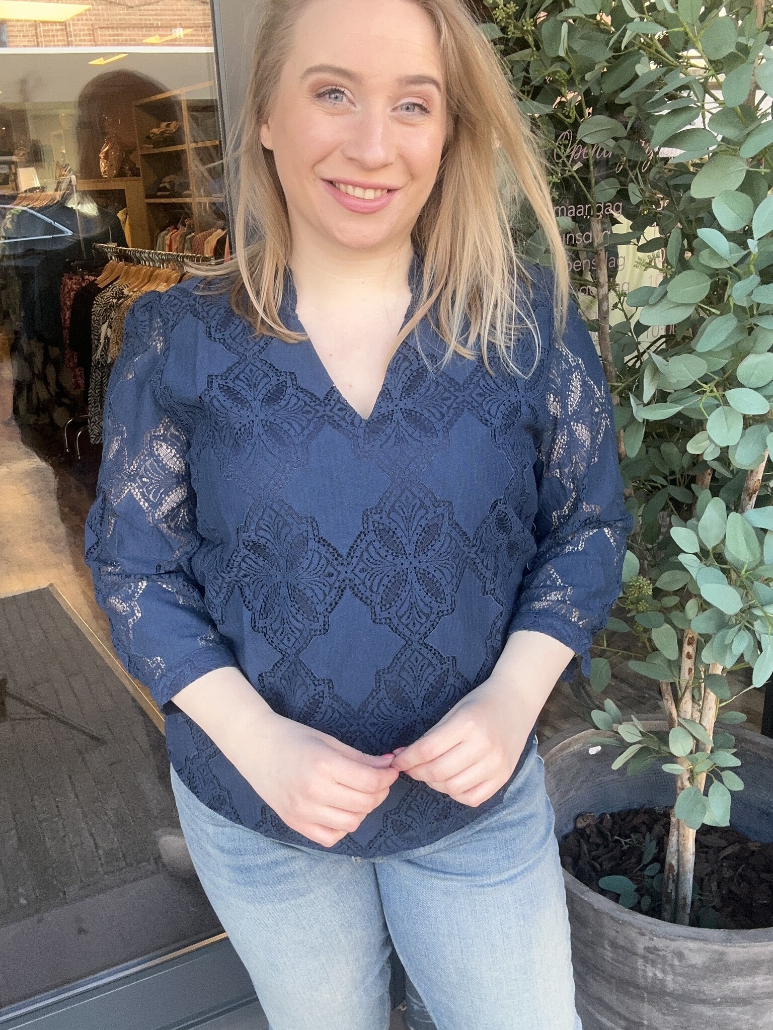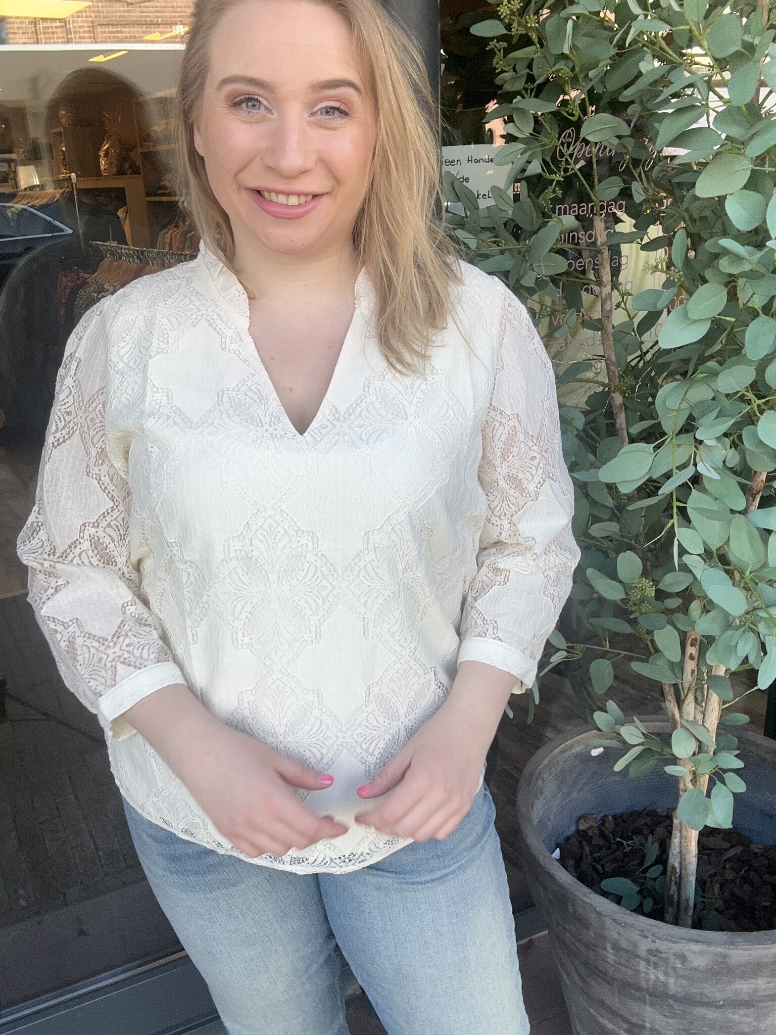 Deze blouse van Beautyvol draagt heerlijk en valt mooi. De blouse heeft een mooie kanten bloemenprint met voering aan de voorzijde. Gemaakt van een luchtige stof voor een fijn draagcomfort. Deze blouse heeft een elegante v-hals en 3/4 mouwen.