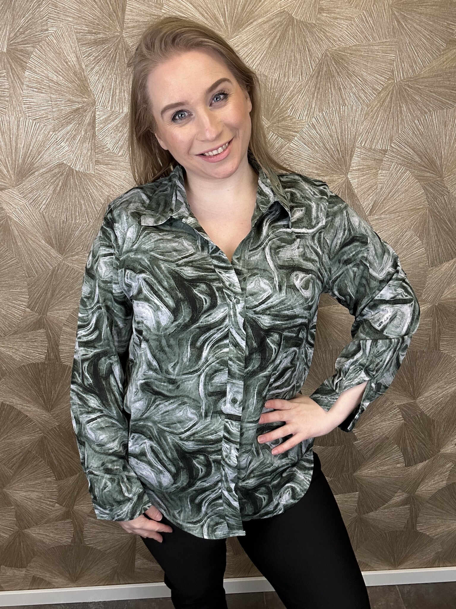 Beautyvol - Super leuke blouse met een mooi marmeren effect in de print. De kleur groen is tijdloos en gemakkelijk te combineren met verschillende kleuren.