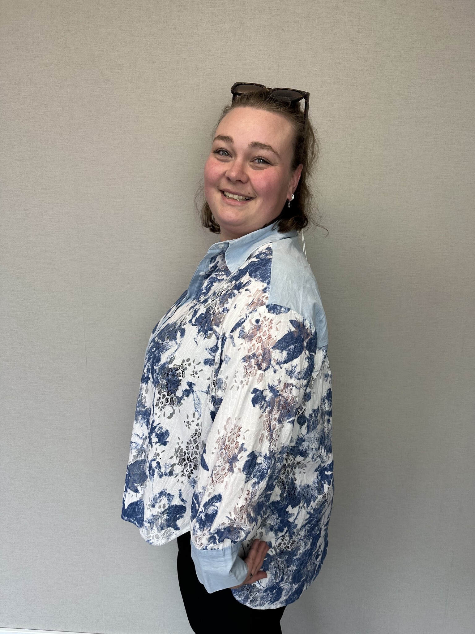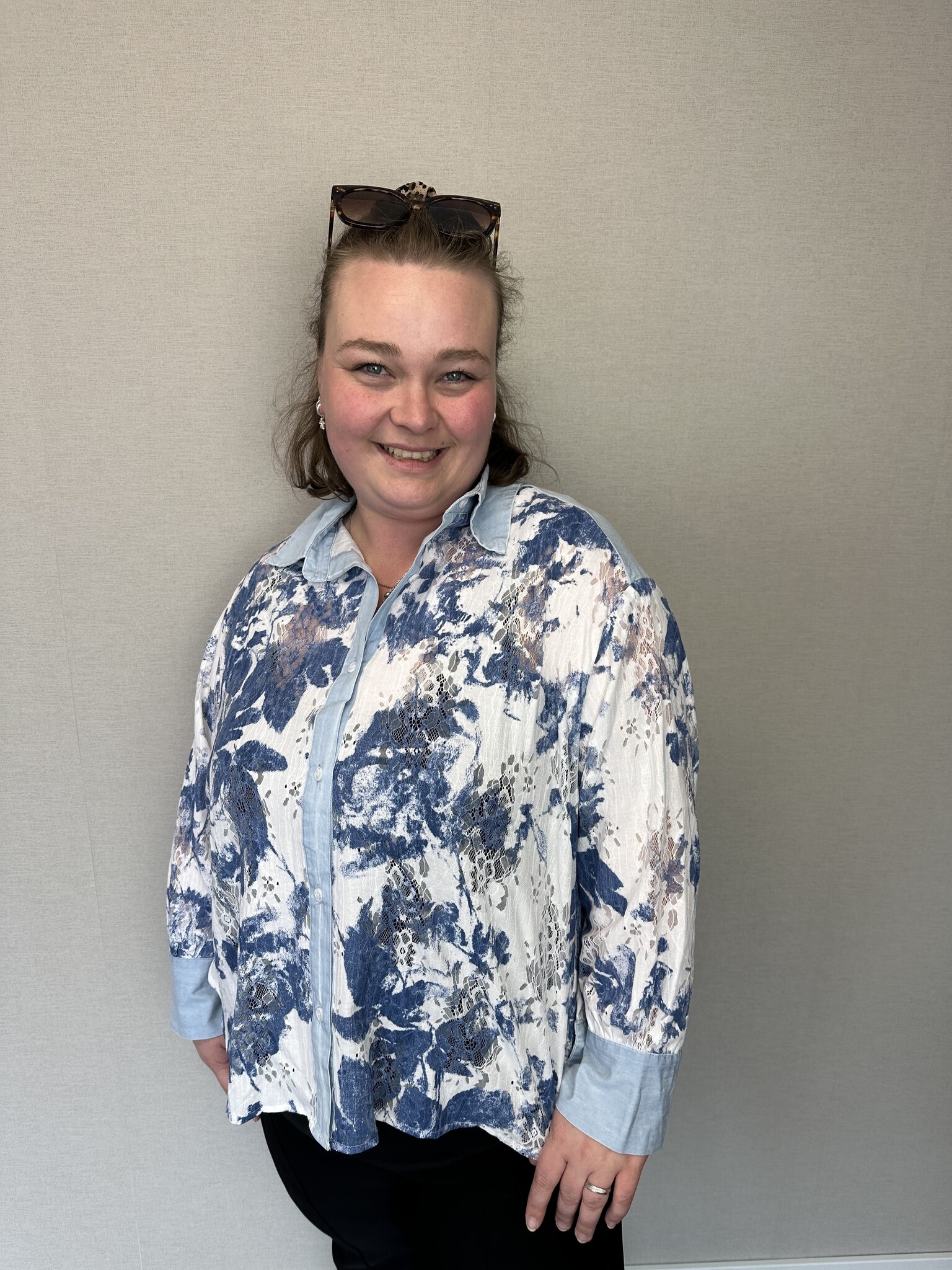 Wauw, wat een beauty! Deze wit met blauwe blouse met opengewerkt kantmotief is een elegant item! Gemaakt van een luchtige stof dat zorgt voor een fijn draagcomfort. De blouse valt achter mooi over de kont. De blouse is afgewerkt met een knoopsluiting en leuke denim details.