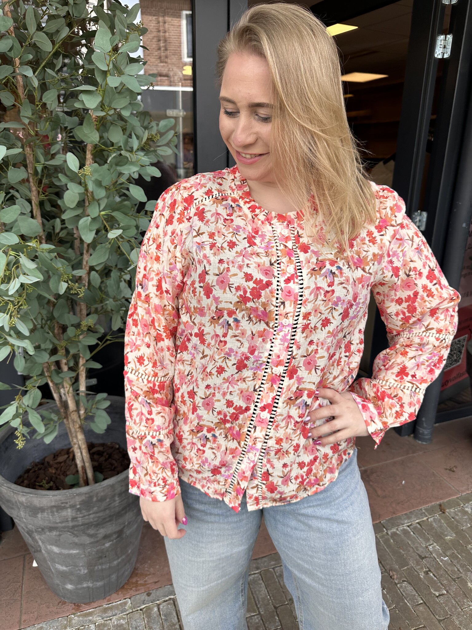 Mooie elegante blouse met verschillende tinten roze. Een leuk stukje broderie en een roezelige hals.