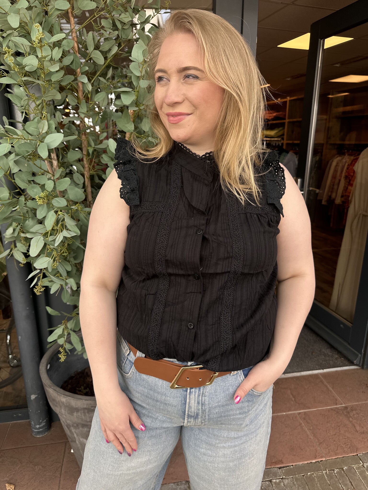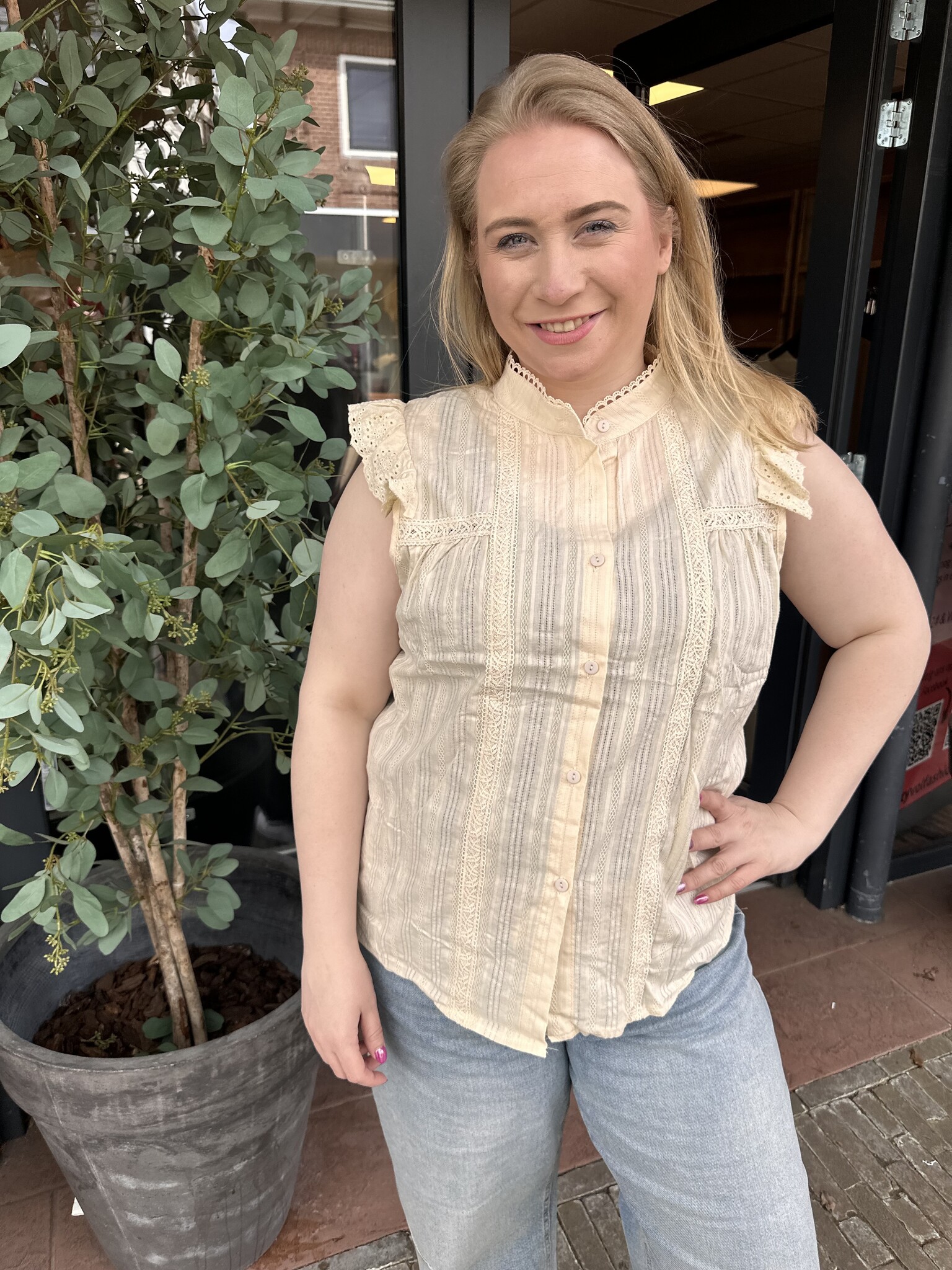 Blouse Moana verkrijgbaar in de kleur zwart en creme. Leuke details met broderie en een gestreept patroontje. De blouse is afgewerkt met een leuke kap-mouw.