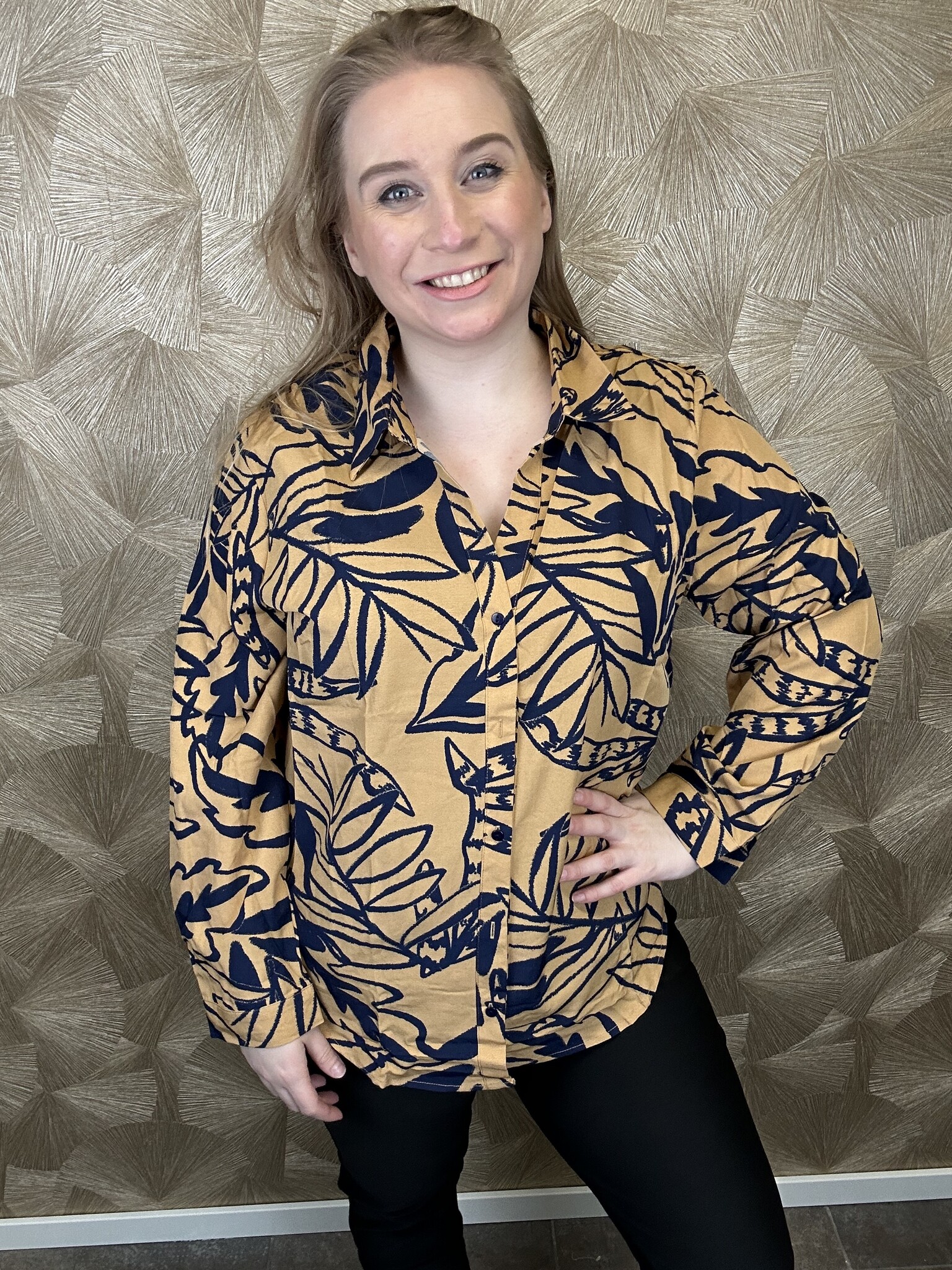 Wat een prachtige blouse exemplaar is deze blouse Selina! Uitgevoerd met de warme tinten navy & okergoud en een speelse bladerenprint & een heerlijke stof, word dit jouw nieuwe favoriet in jouw garderobe!