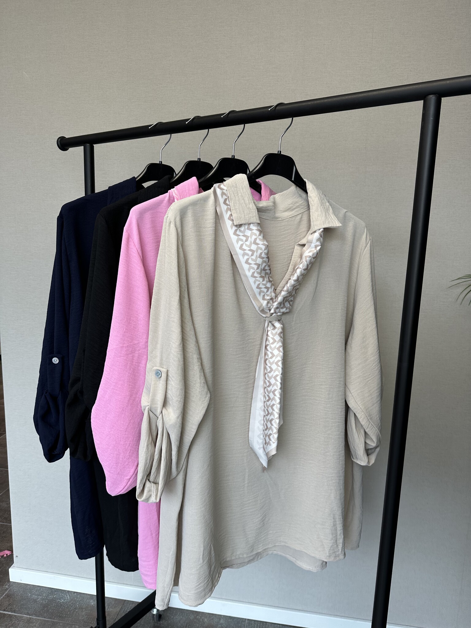 Blouse Sisi is een elegant vallende blouse met een leuke sjaal die aan de blouse vastzit. De blouse valt lang en de mouwen kun je fijn opknopen.