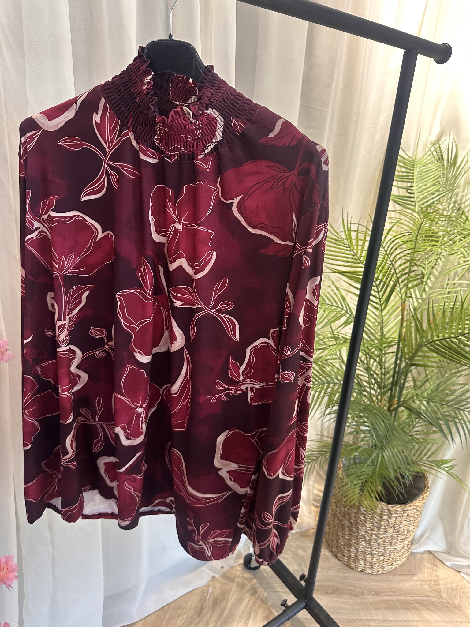 Super leuke blouse met kol in een mooie bordeaux rode kleur en leuke print.