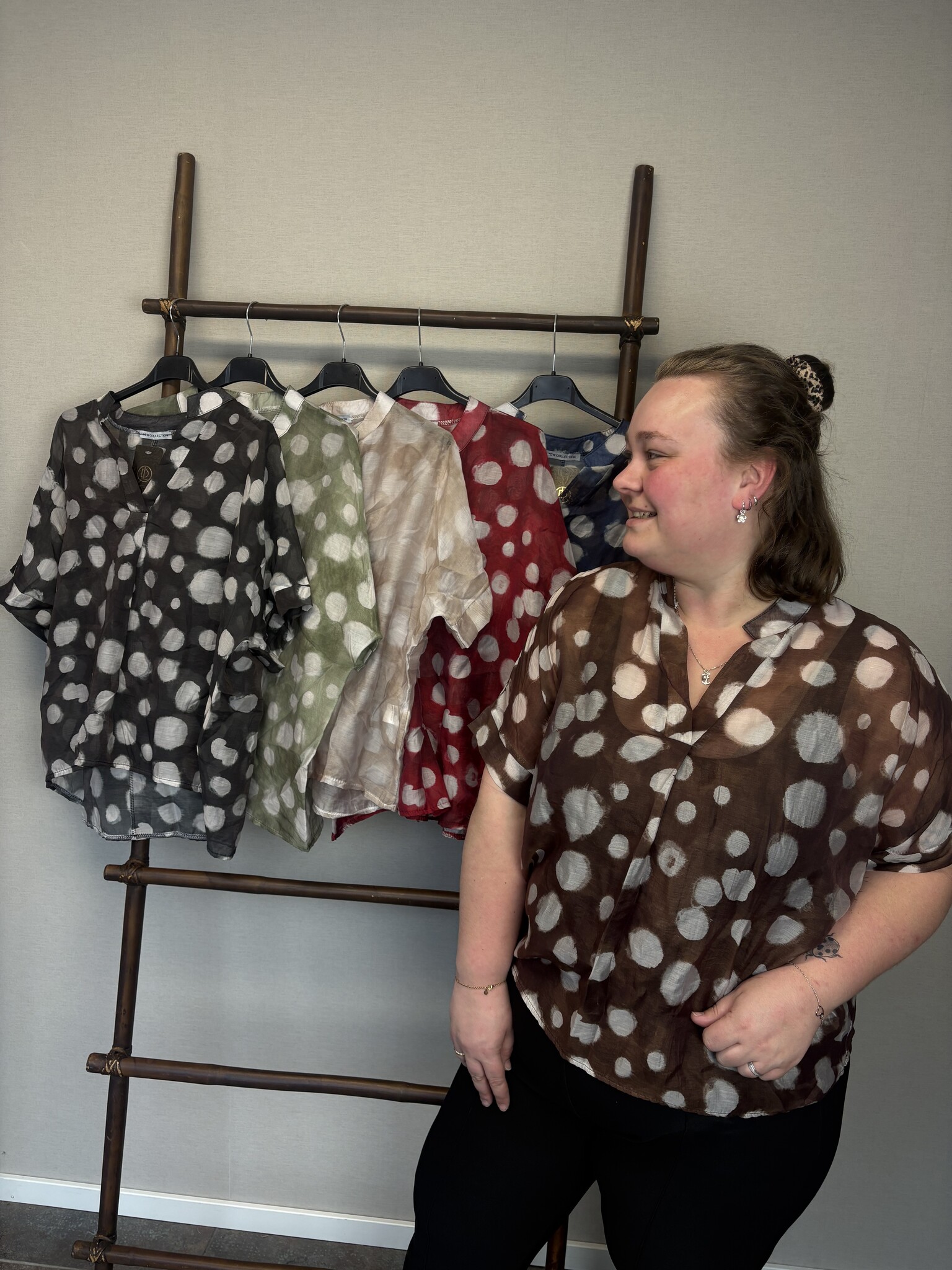 Pasvorm: deze blouse is een one size en heeft een losvallende pasvorm.