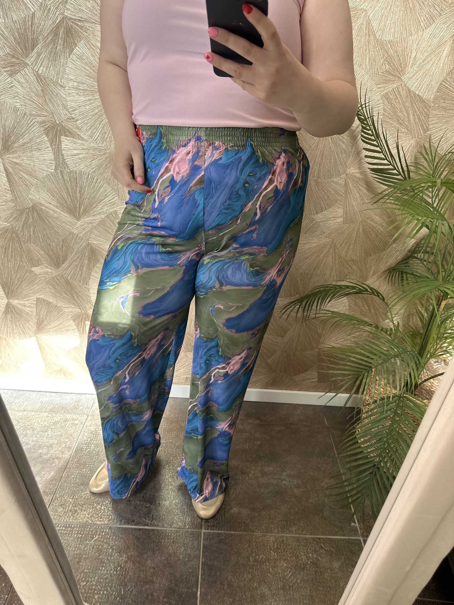 Deze broek van Magna Fashion zit comfortabel en heeft een regular fit pasvorm. De broek is beschikbaar in een mooie marmerprint. Gemaakt van een luchtige stof dat zorgt voor een fijn draagcomfort. De broek is afgewerkt met een elastische tailleband met een koord en steekzakken. Een casual broek die leuk te combineren is met een blouse!