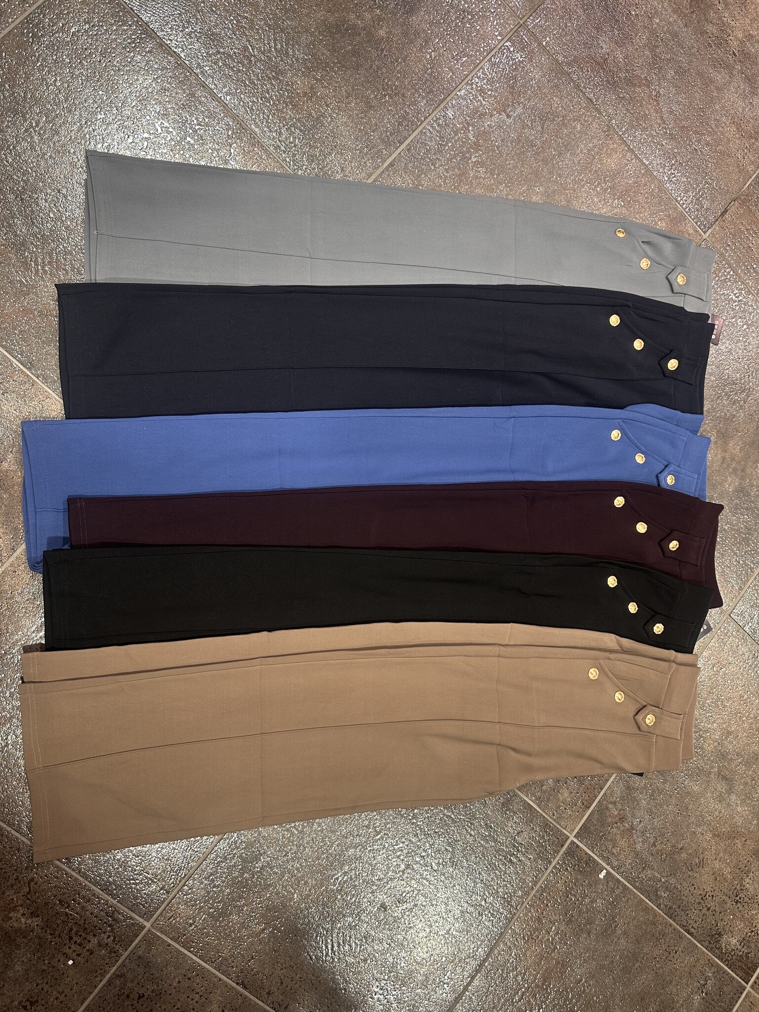 Deze leuke high-waist broek heeft een chique uitstraling door de gouden knopen aan beide kanten langs de broekzakken. Op de achterkant heeft de broek geen zakken. Door het elastiek in de taille is dit een comfortabele broek die perfect te stylen is in een elegante outfit.