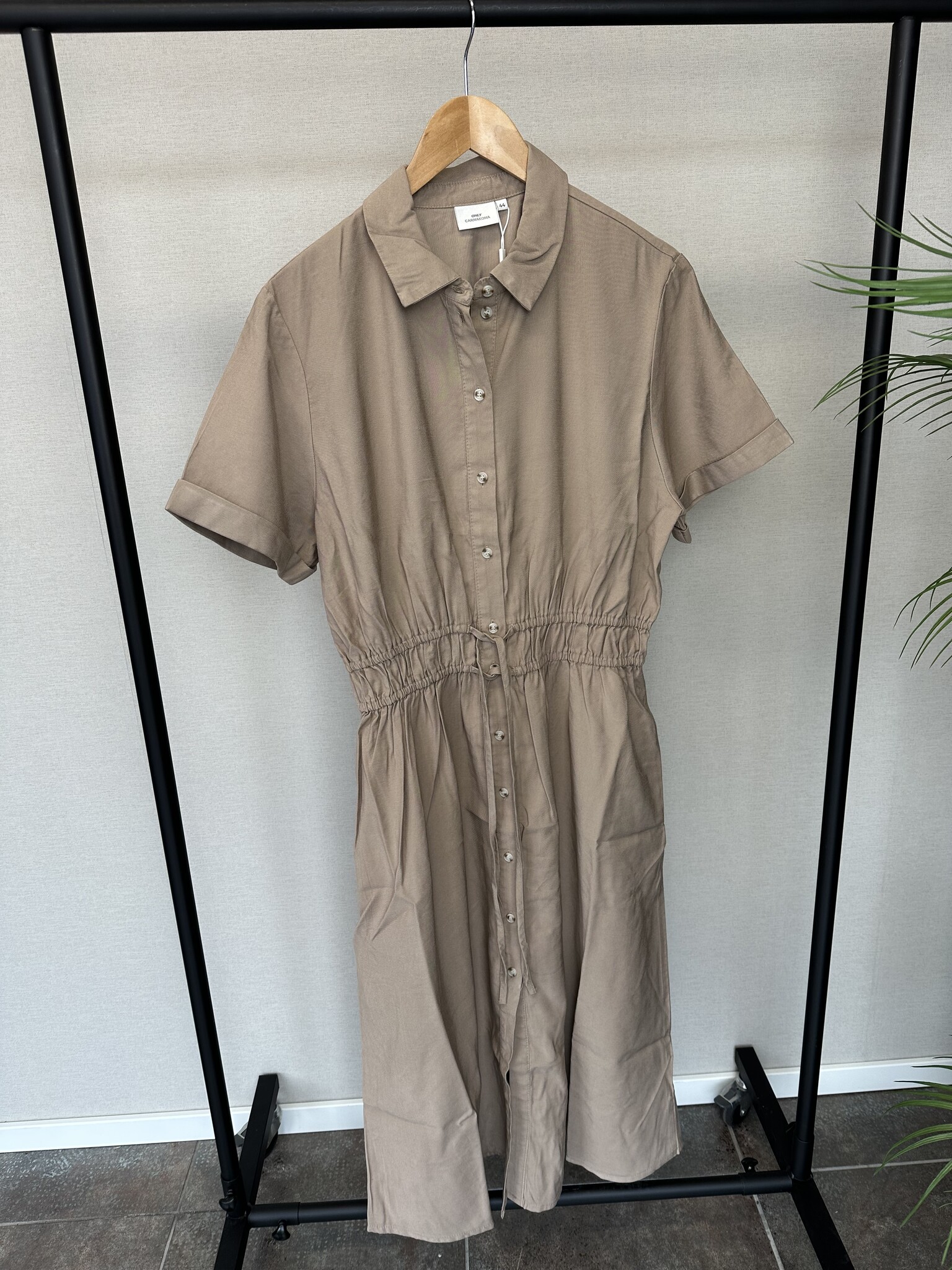 Op zoek naar een casual chic jurk? Deze jurk van Only Carmakoma heeft een mooie taupe kleur. De losvallende pasvorm vanuit de taille zorgt voor een fijne fit. Gemaakt van een stevige stof voor extra draagcomfort. Afgewerkt met knoopsluiting over de gehele lengte, dubbel elastiek in de taille met koordjes voor een mooi effect en de jurk heeft twee zakken op de heupen.