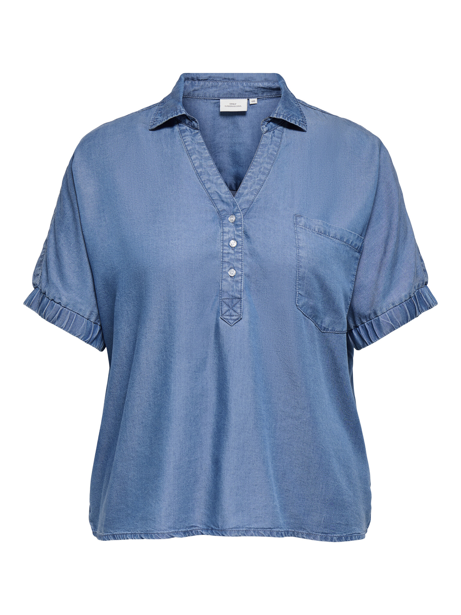 Dit denim blauwe shirt van Only Carmakoma draagt heerlijk en heeft een losvallende pasvorm. Het shirt heeft een mooie denim blauwe kleur. Gemaakt van een luchtige stof dat zorgt voor een fijn draagcomfort. Het shirt is afgewerkt met een V-hals met knoopsluiting, elastiek in de mouwen en een borstzak. Een casual shirt dat leuk te combineren is op een jeans!
