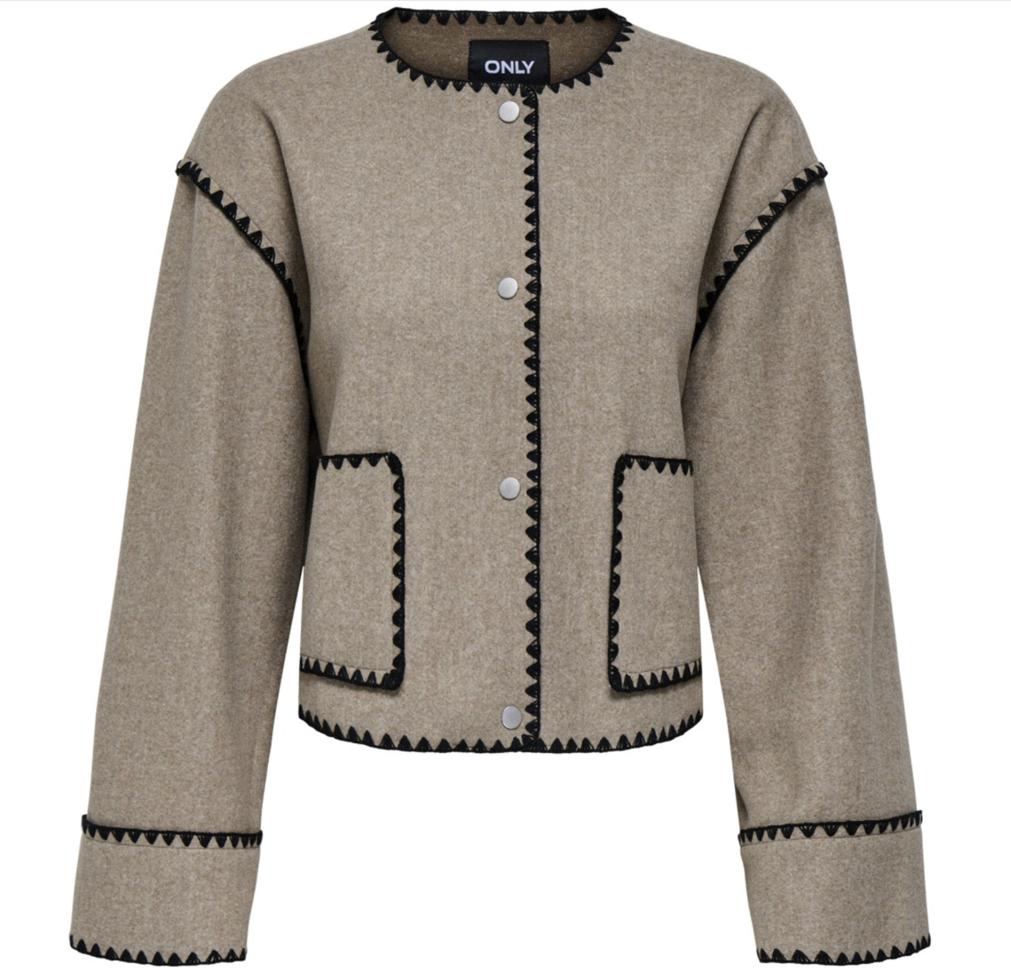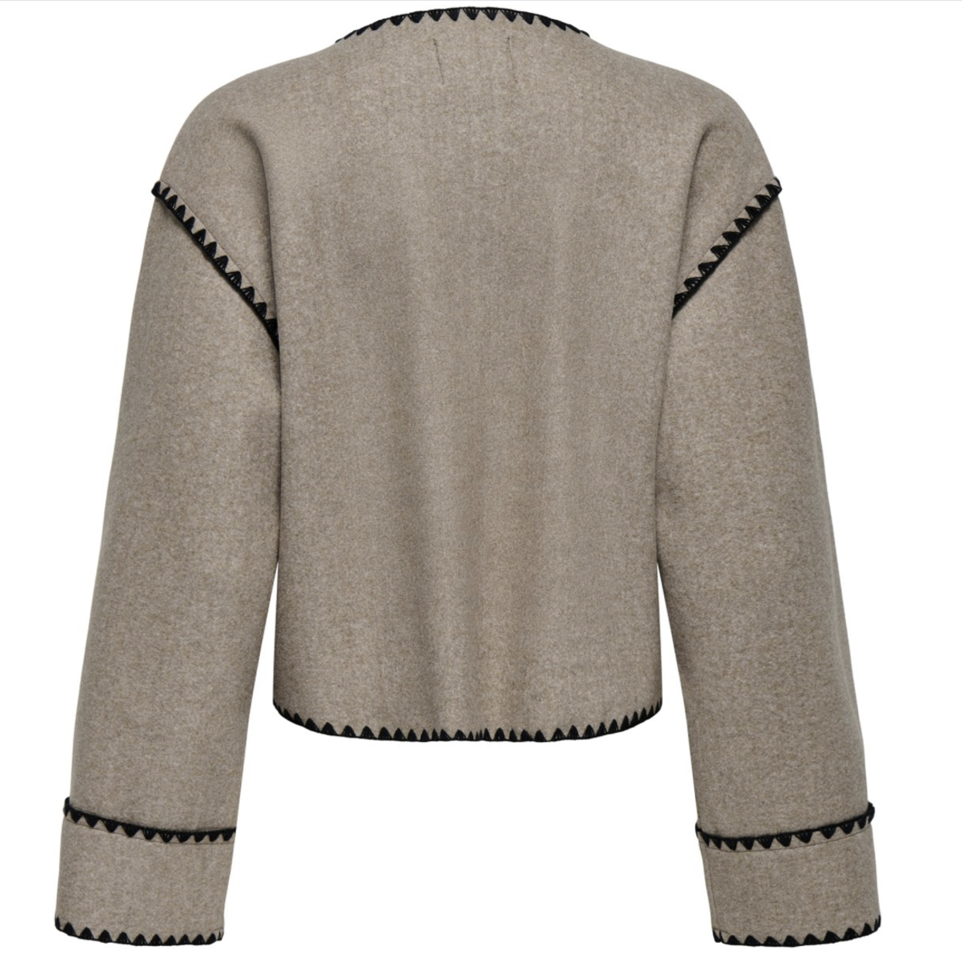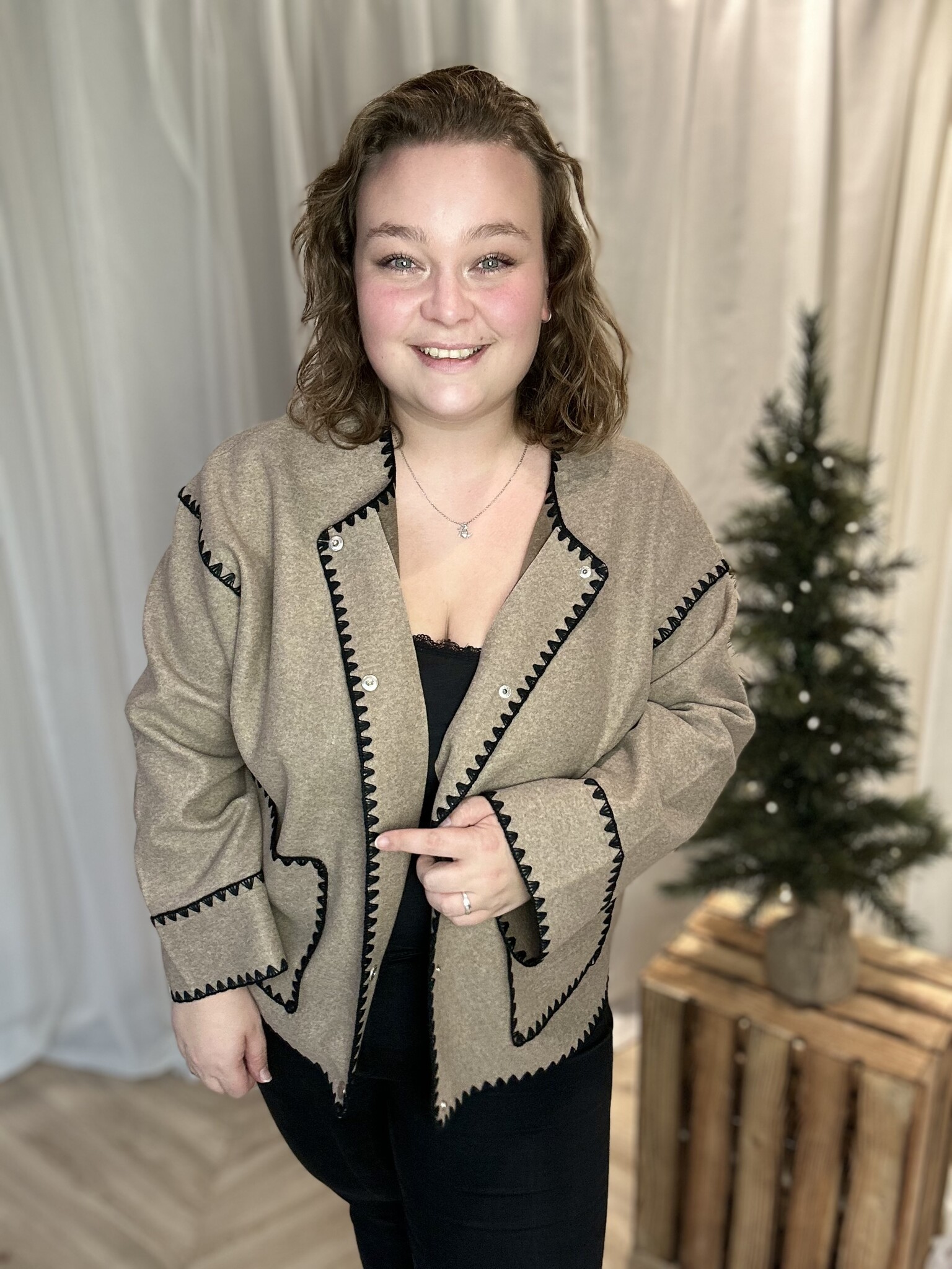 Dit mooie jasje van luxe viltenstof geeft elke outfit een stijlvolle, hoogwaardige uitstraling. Het jasje sluit met handige drukknopen en is afgewerkt met prachtige zwarte details, wat zorgt voor een chique en moderne look. Een ideaal item om zowel casual als classy te dragen.