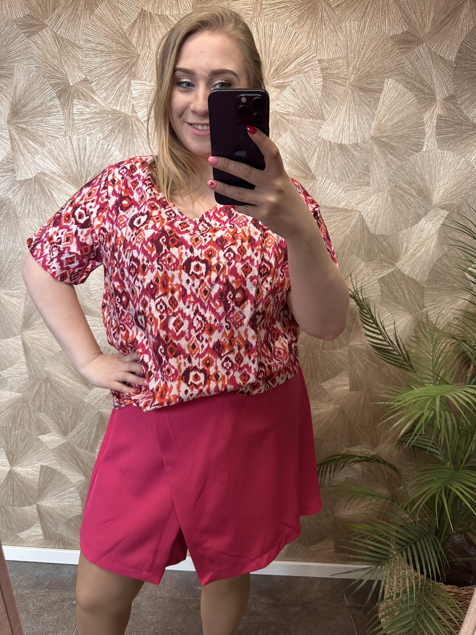 Dit vrolijke shirt van Only Carmakoma draagt heerlijk luchtig. De levendige print in warme roze- en roodtinten geeft een fleurige uitstraling. De zachte stof voelt prettig aan en draagt comfortabel. Dit shirt heeft een lichte V-hals.