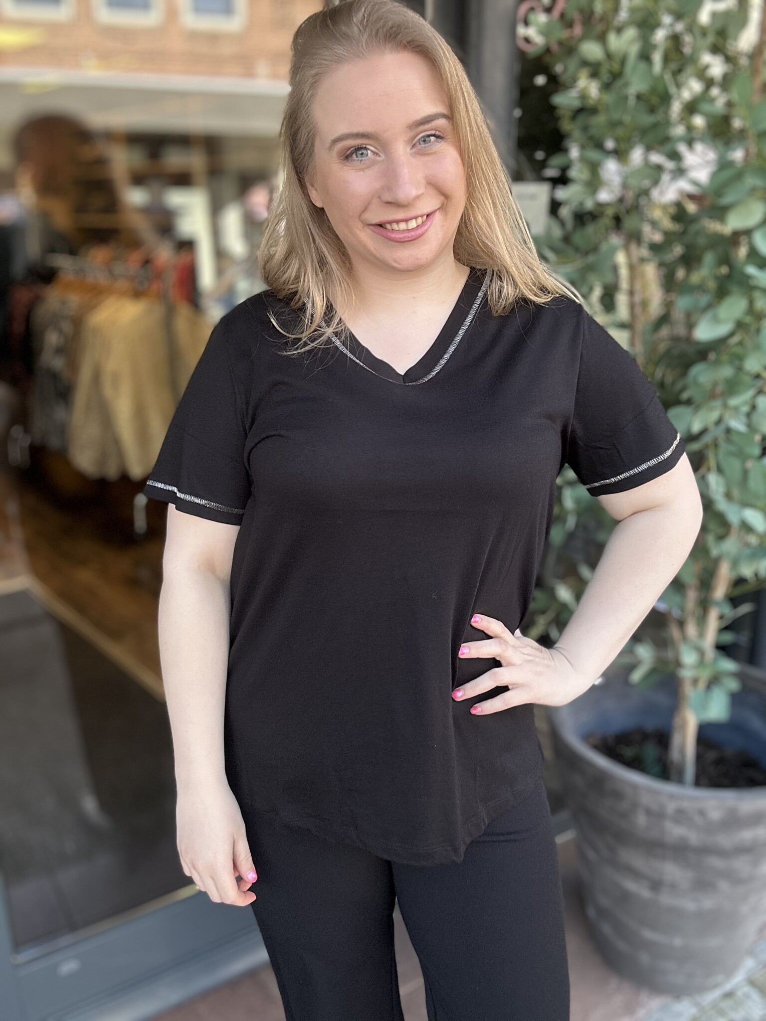 Dit shirt van Only Carmakoma met een v-hals heeft een mooie basic zwarte kleur. Gemaakt van katoenen stof, waardoor het item prettig draagt. Het shirt heeft een comfortabele pasvorm. Rond de hals en de mouwen heeft het shirt een leuke afwerkingssteek. Leuk te combineren met je favoriete jeans.