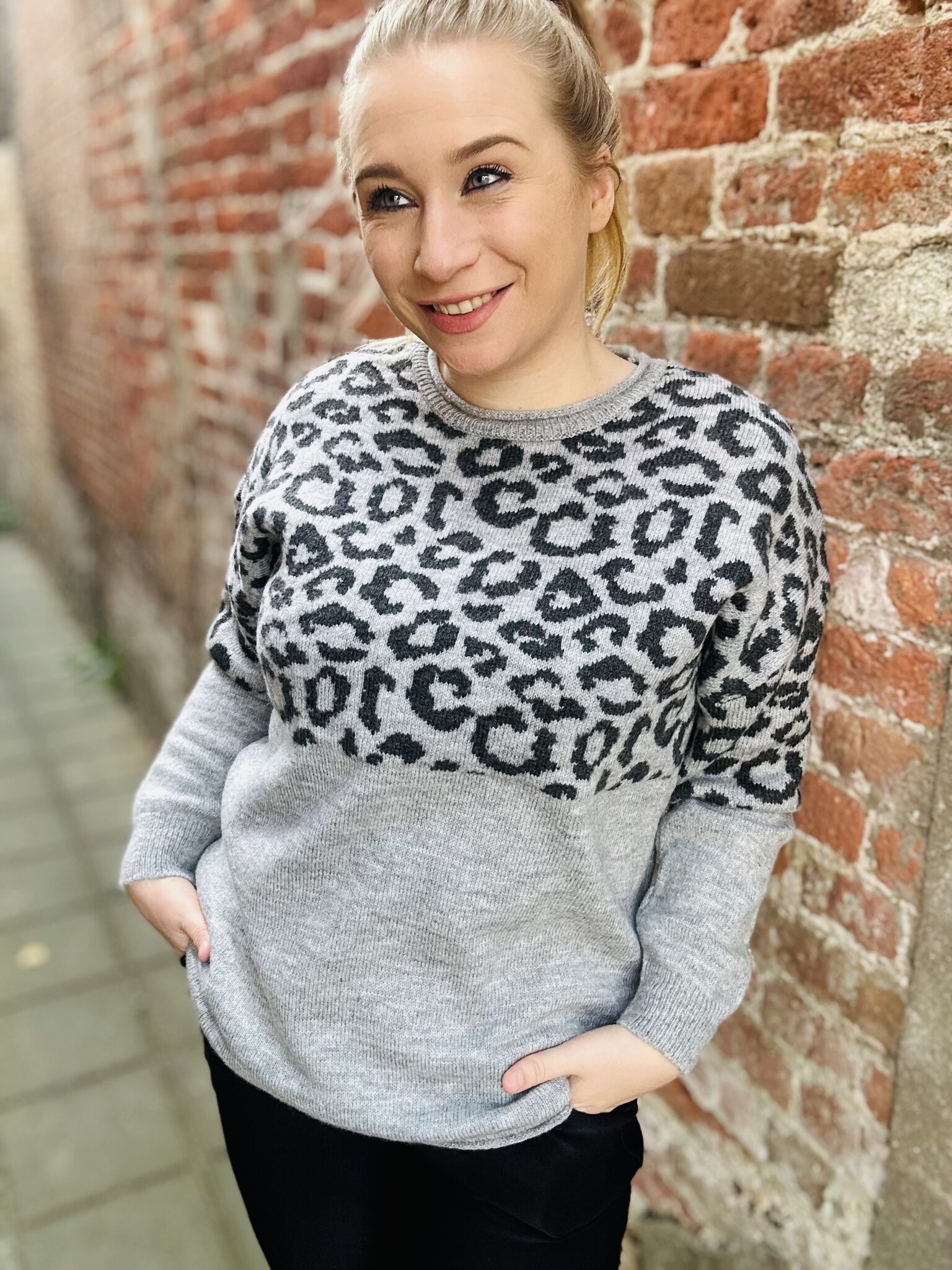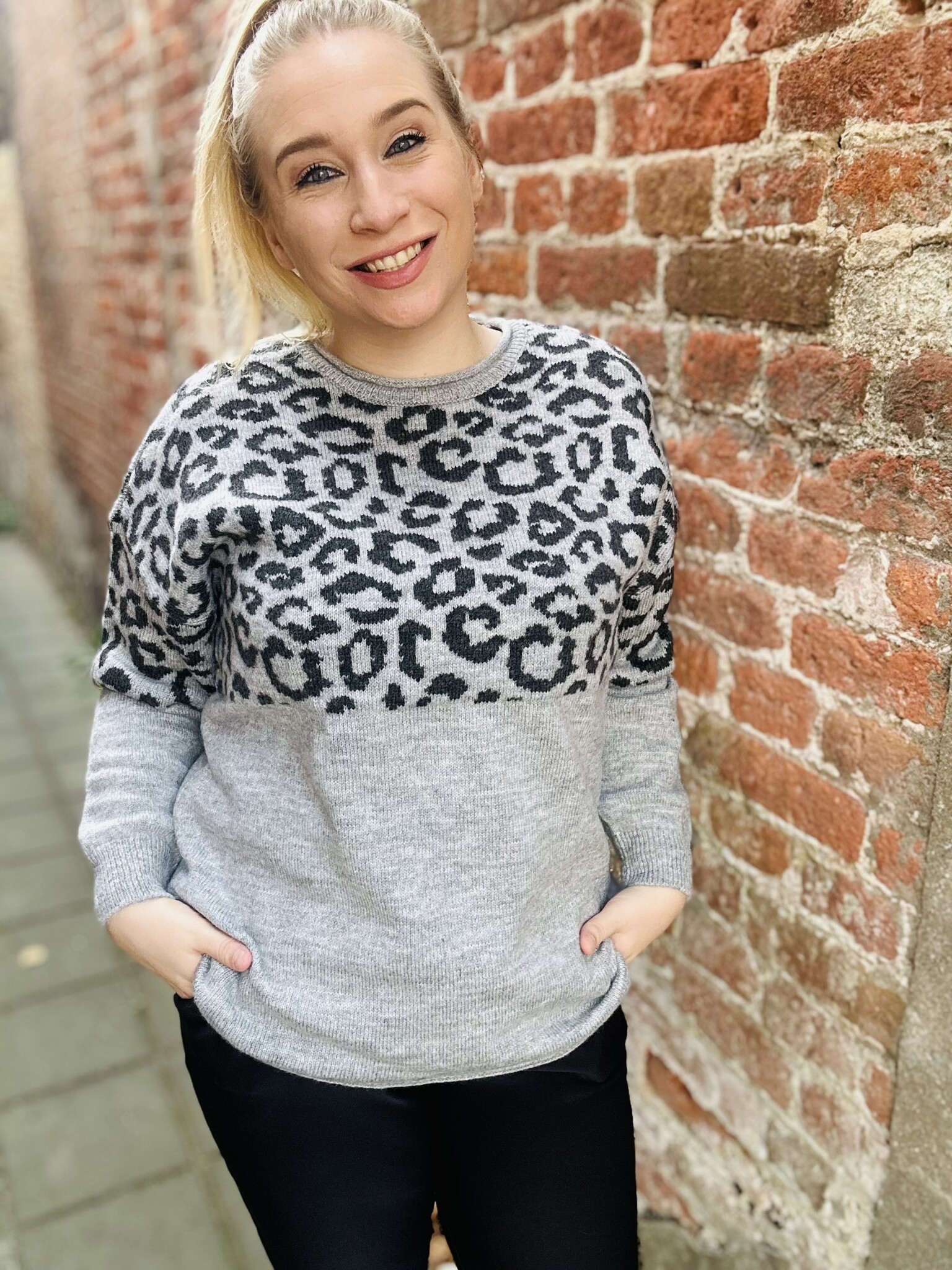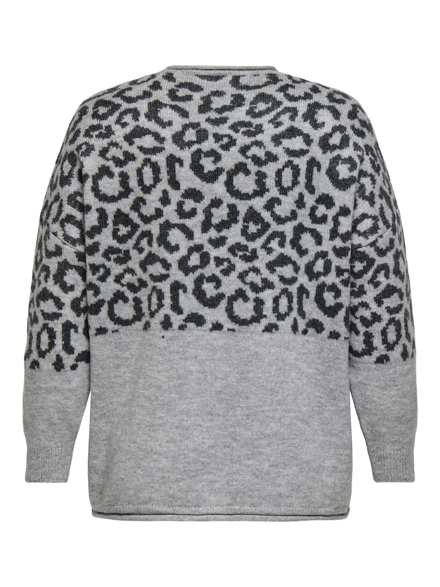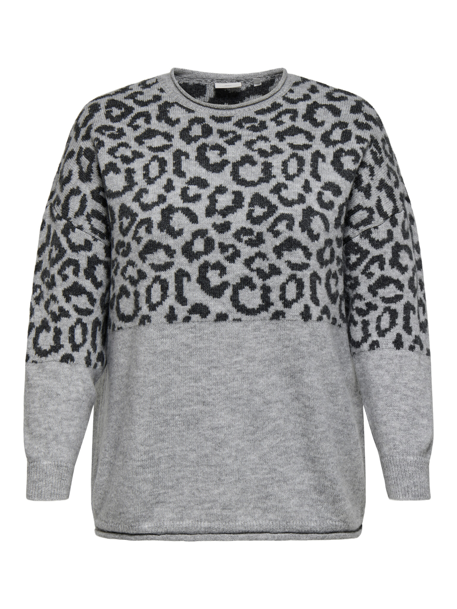 Only Carmakoma - Super leuke grijze trui met op het bovenste deel van de trui een panterprint. De trui heeft een ronde hals en draagt heerlijk. Gemaakt van acryl en polyester.