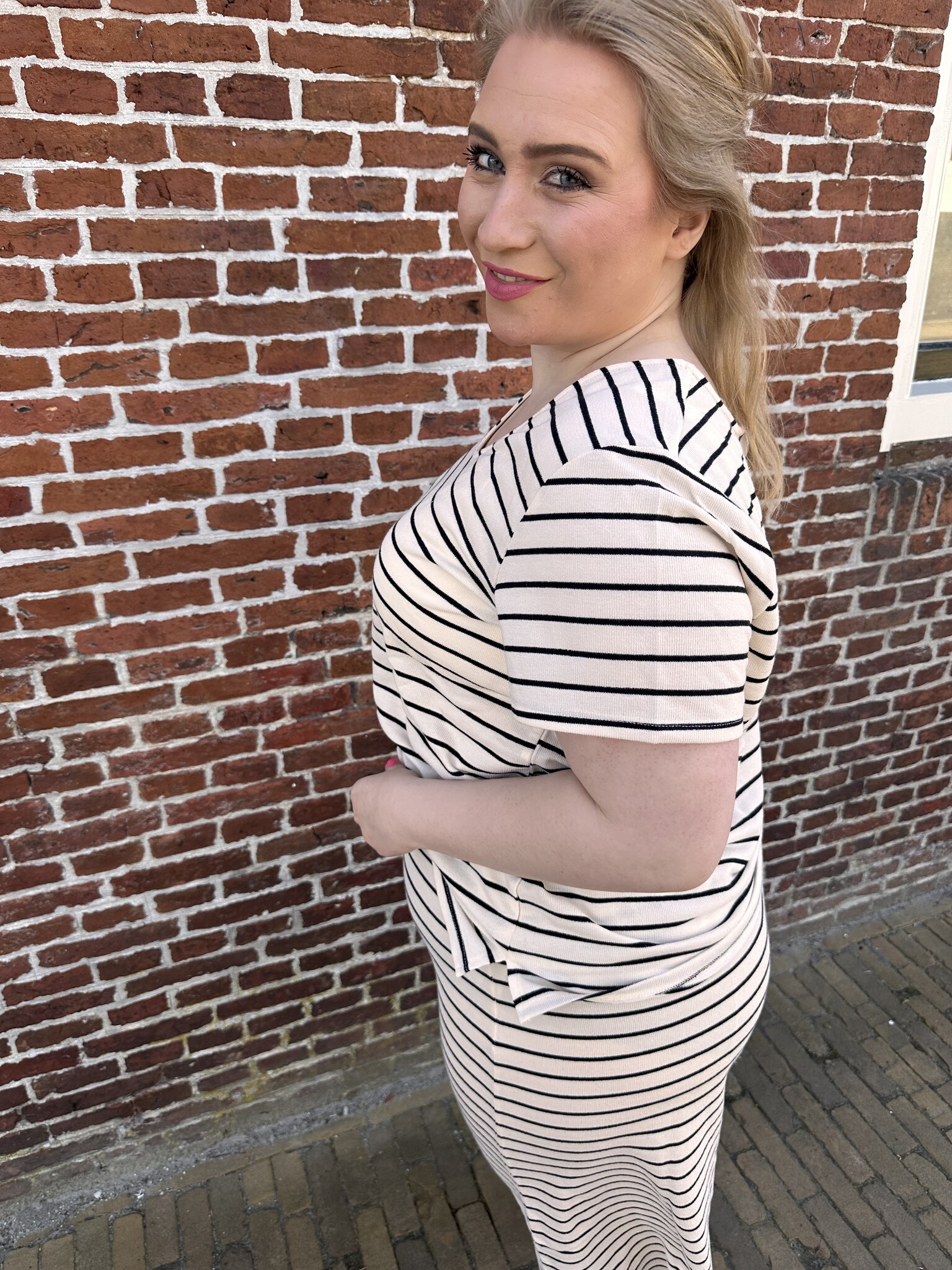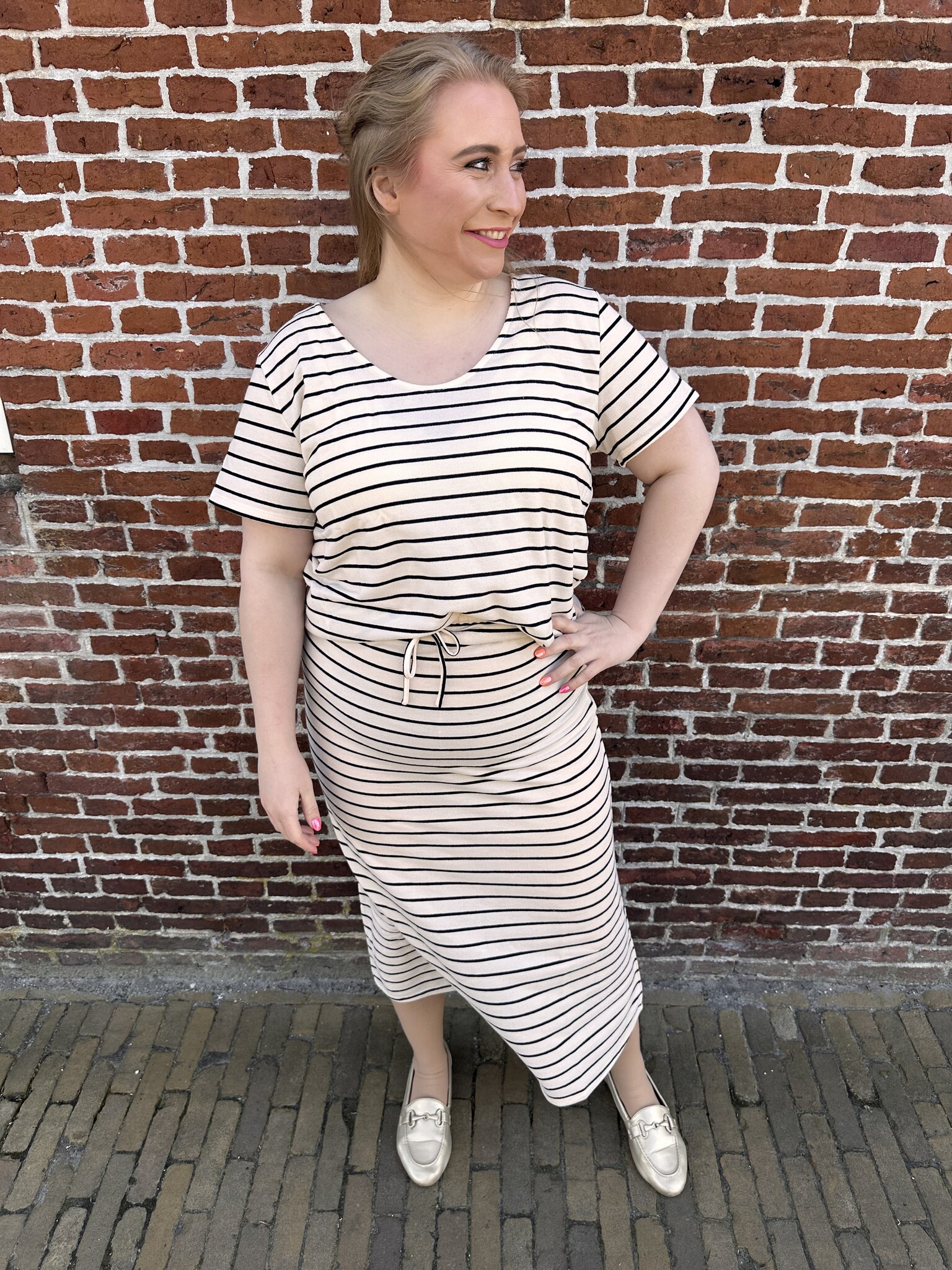 Nynke is 165 cm en draagt maat 42/44.